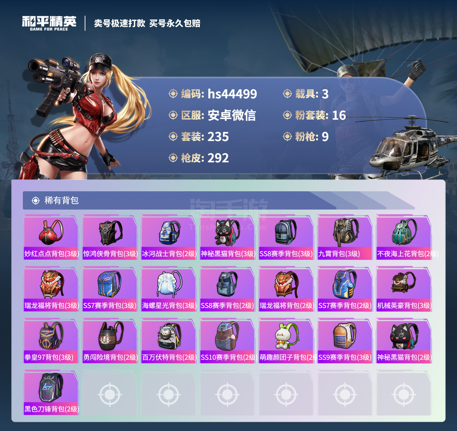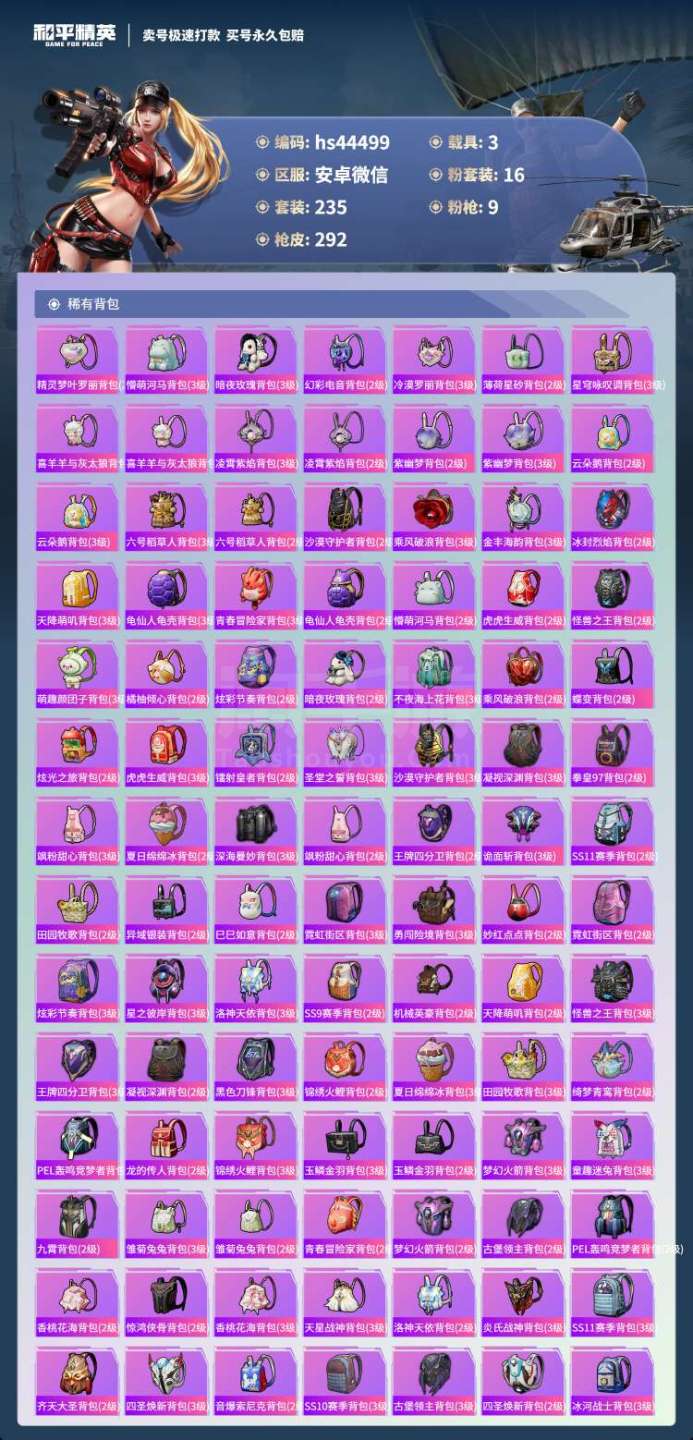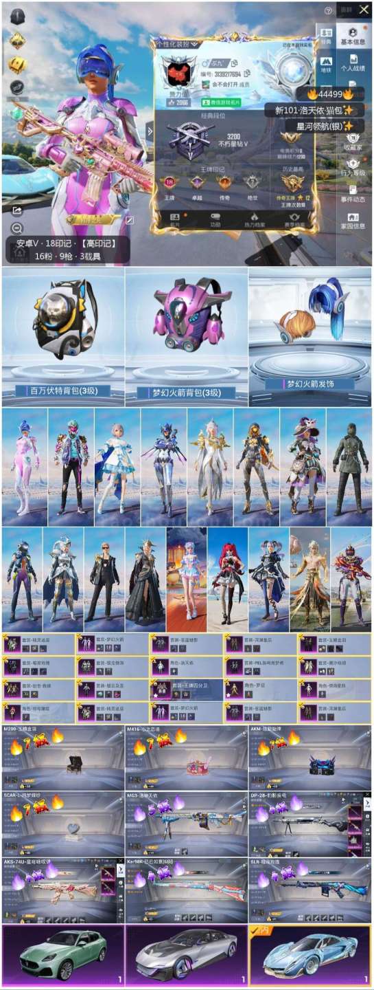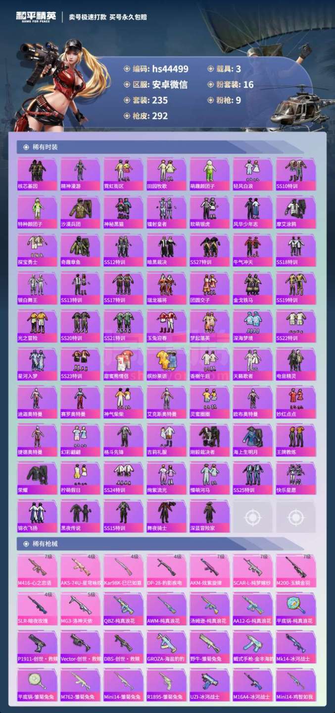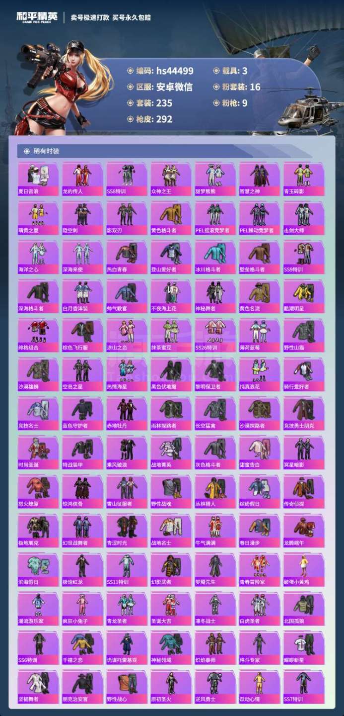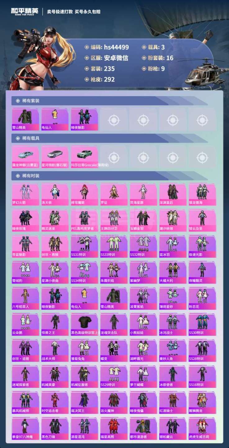 hs44499 安卓微-18王牌印记-16粉装-9特效枪-3载具-108209热力值-235套装-