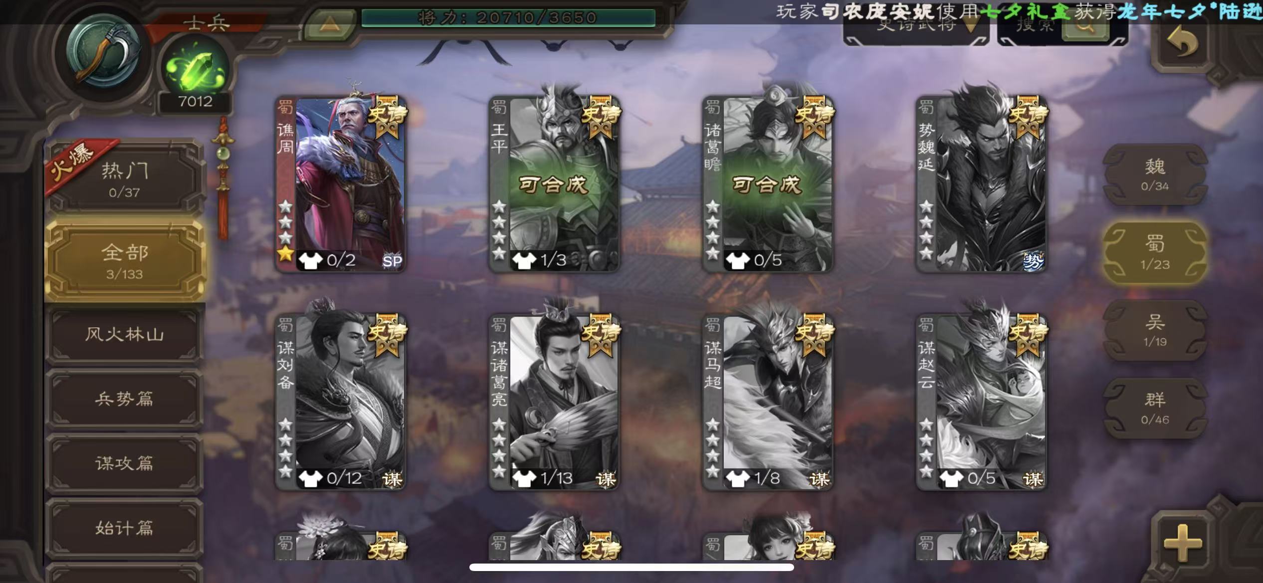 士兵势太史慈神刘备谯周7000将魂5万羽毛三卡