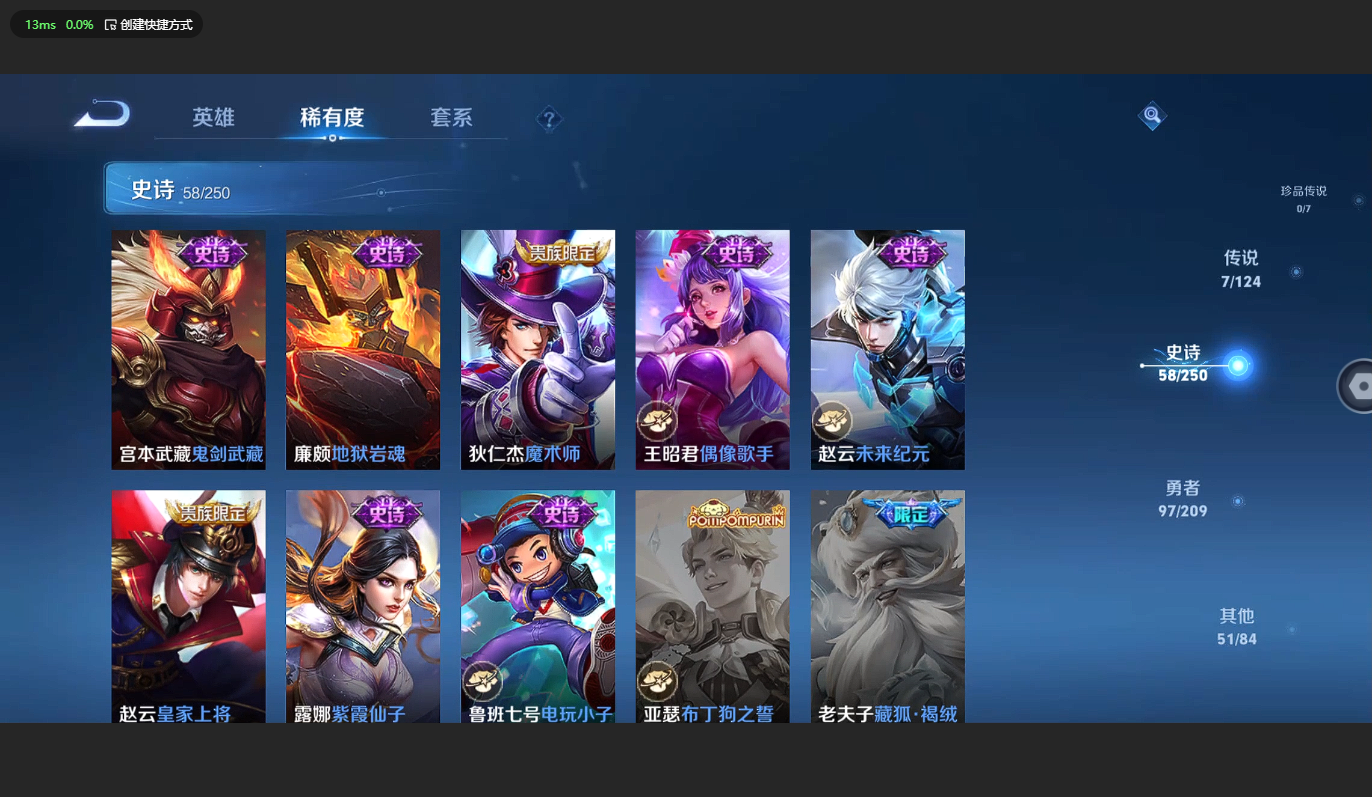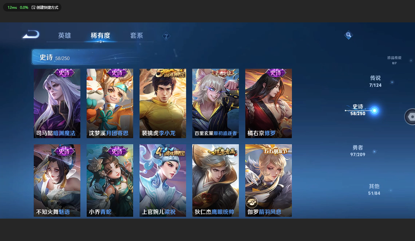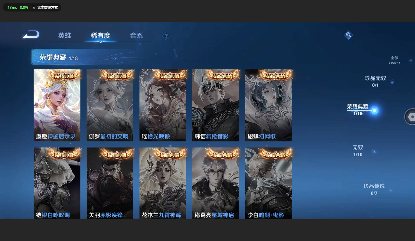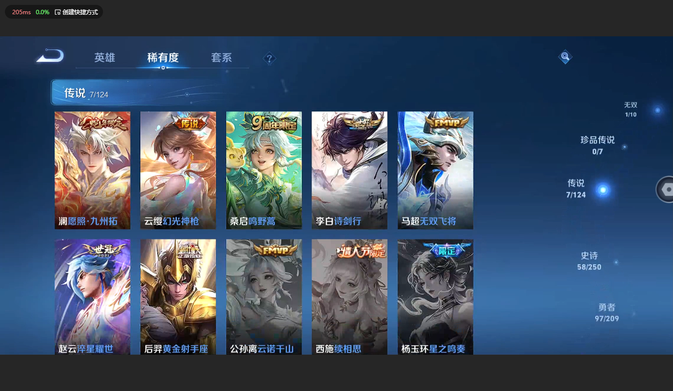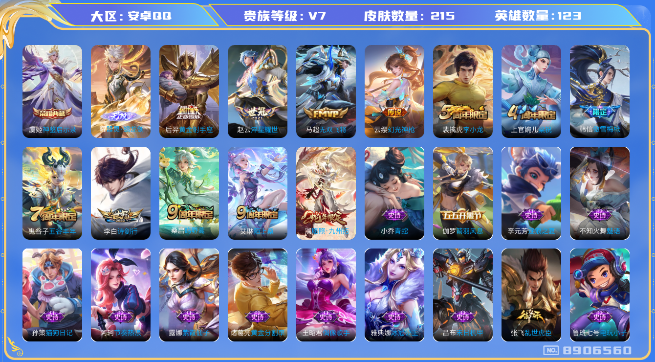 营地账号:469688410/[8906560]1典藏 1无双 7传说 65限定 实名: 可修改 贵族等级: V7 英雄数: 123 皮肤数: 215 荣耀水晶: 神鉴启示录 无双皮: 器灵·螭龙剑 皮肤: 黄金射手座,淬星耀世,无双飞将,幻光神枪 李小龙,梁祝,傲雪梅枪,五谷丰年,诗剑行,鸣野蒿,陌上桑,愿照·九州拓
