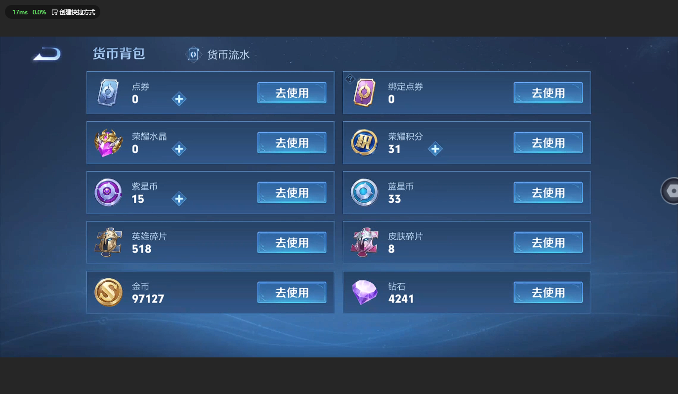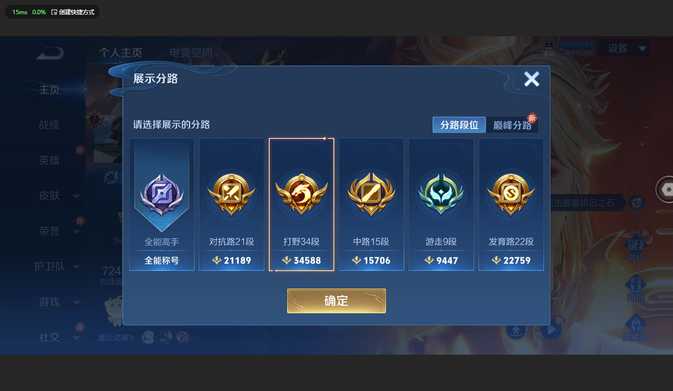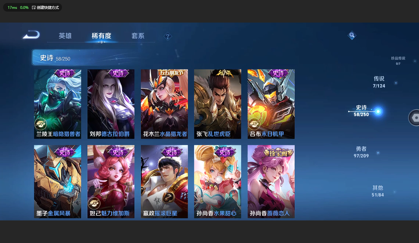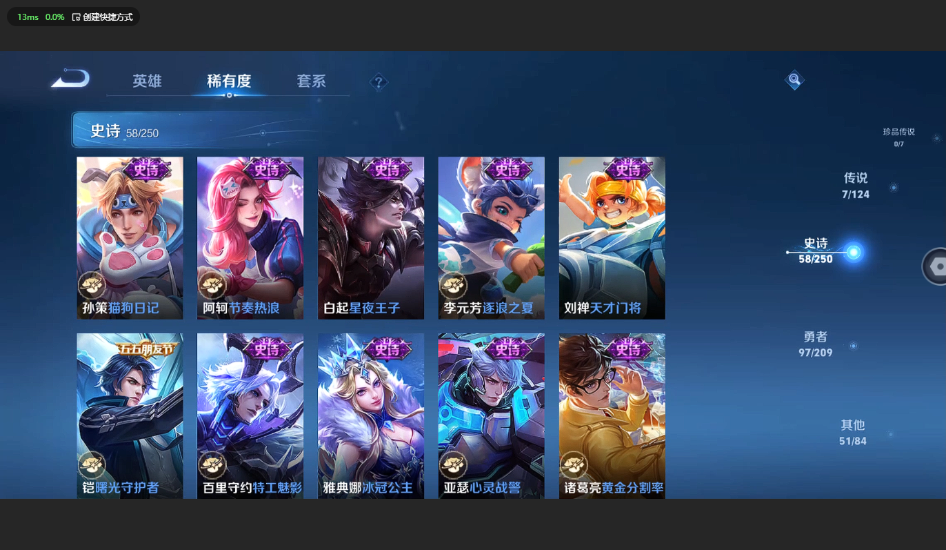 营地账号:469688410/[8906560]1典藏 1无双 7传说 65限定 实名: 可修改 贵族等级: V7 英雄数: 123 皮肤数: 215 荣耀水晶: 神鉴启示录 无双皮: 器灵·螭龙剑 皮肤: 黄金射手座,淬星耀世,无双飞将,幻光神枪 李小龙,梁祝,傲雪梅枪,五谷丰年,诗剑行,鸣野蒿,陌上桑,愿照·九州拓