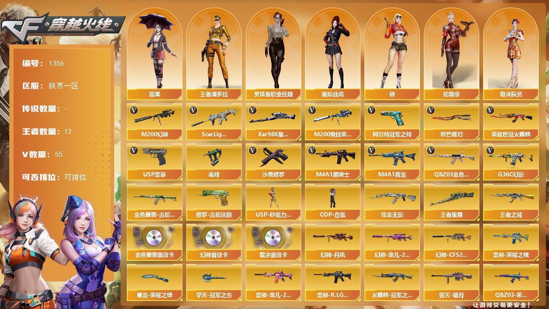 2164534_四川一区 实名可改 73V3传说28王者 M200-幻神 (5皮/音效卡) 传说圣灵 传说辉光 传说暗裔 王者星神觉醒版 M200-竞技荣光 QBZ03-金色蔷薇 (冠军之薇/女团/音效卡) QBZ-03-王者蔷薇觉醒版 6烈龙+蝴蝶 6烈龙 Scar-白虎 (暗星/音效卡) 白虎电玩蓝兔 HK417-朱雀 Barrett-毁灭 (枪娘/荣耀/冠军/音效卡) Barrett-朱雀