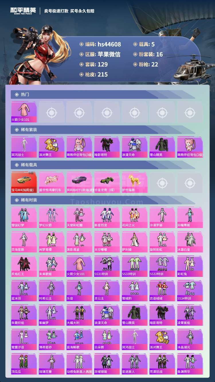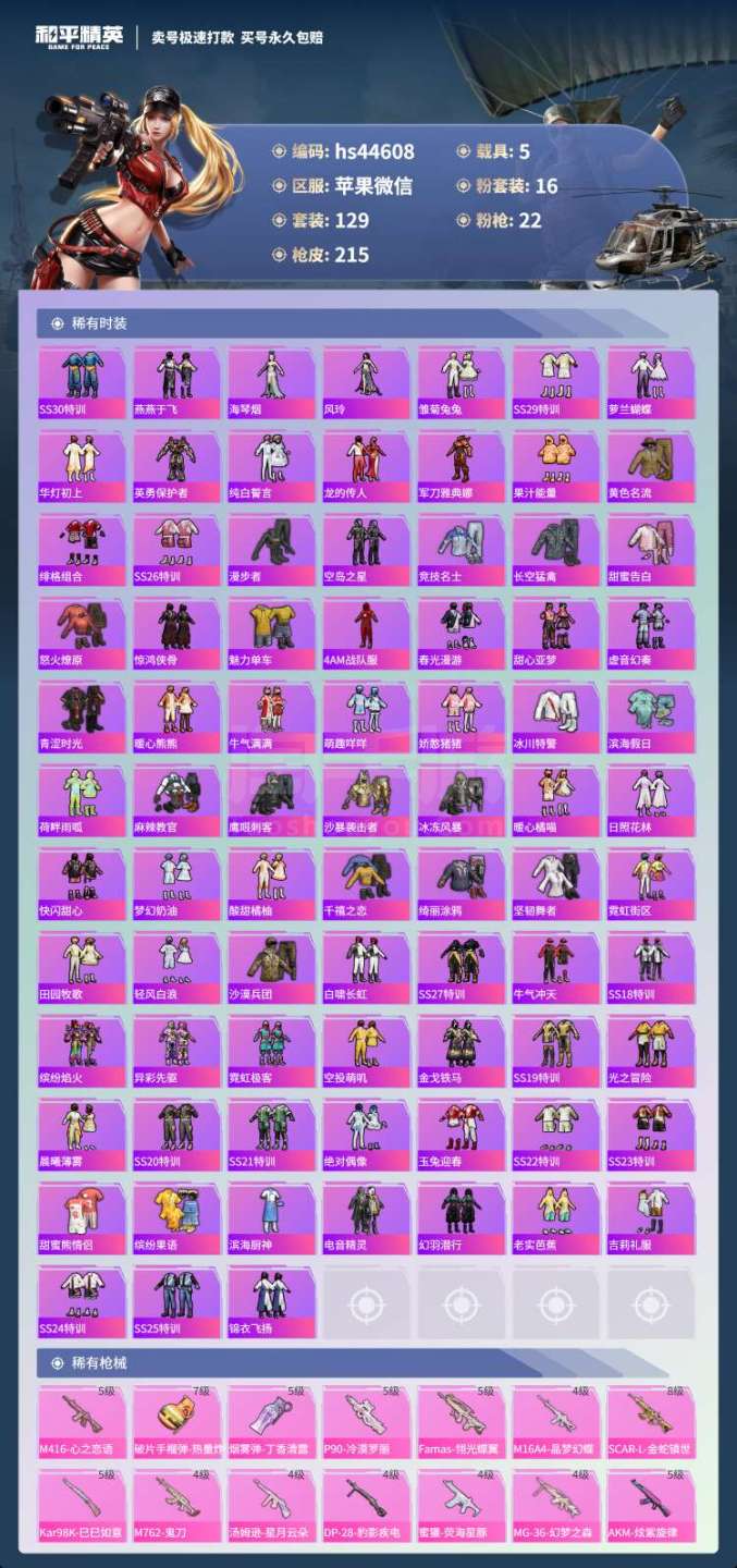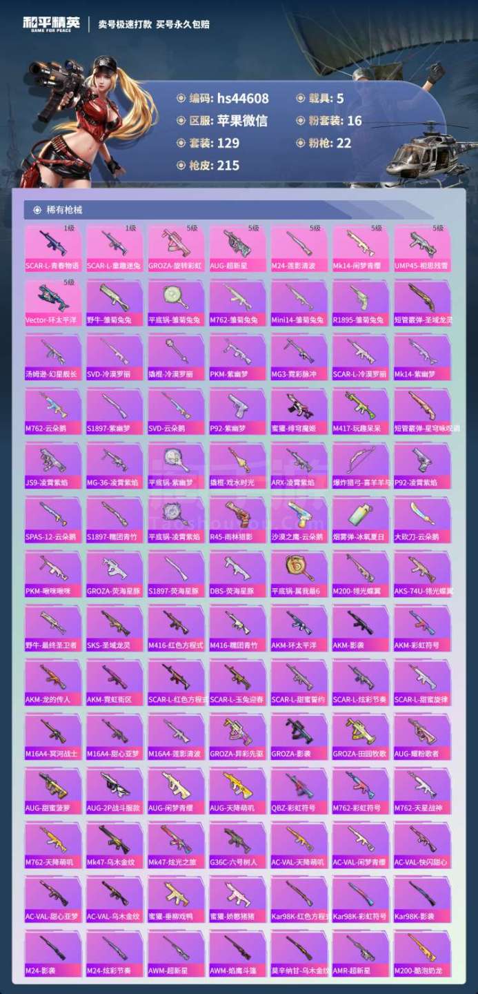 和平精英【苹果微信】hs44608 苹果微-9王牌印记-16粉装-22特效枪-5载具-90462热力值-129套装-2