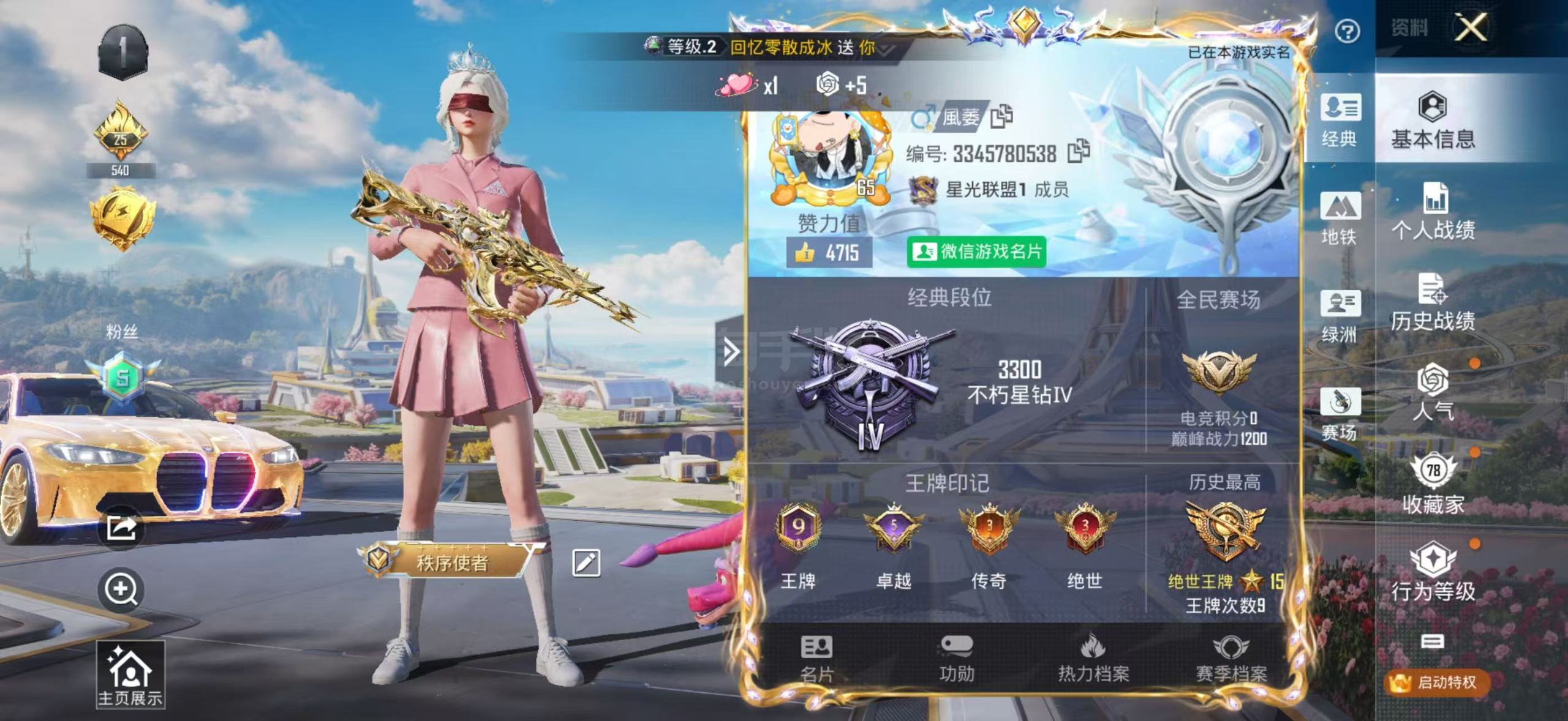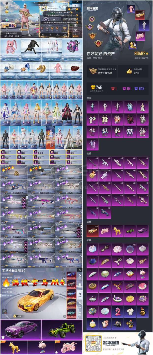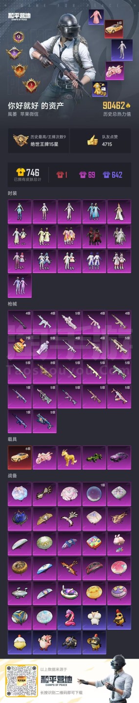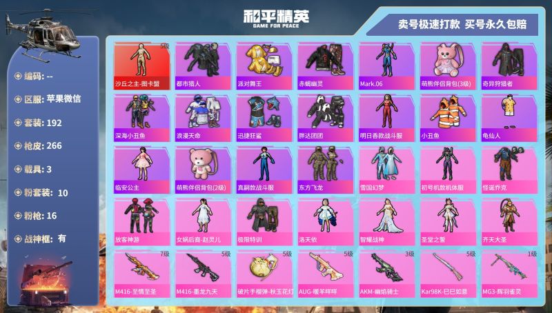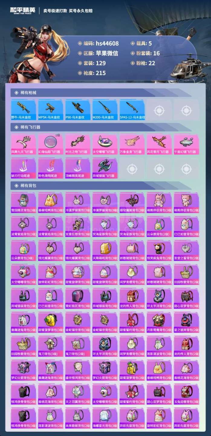 和平精英【苹果微信】hs44608 苹果微-9王牌印记-16粉装-22特效枪-5载具-90462热力值-129套装-2