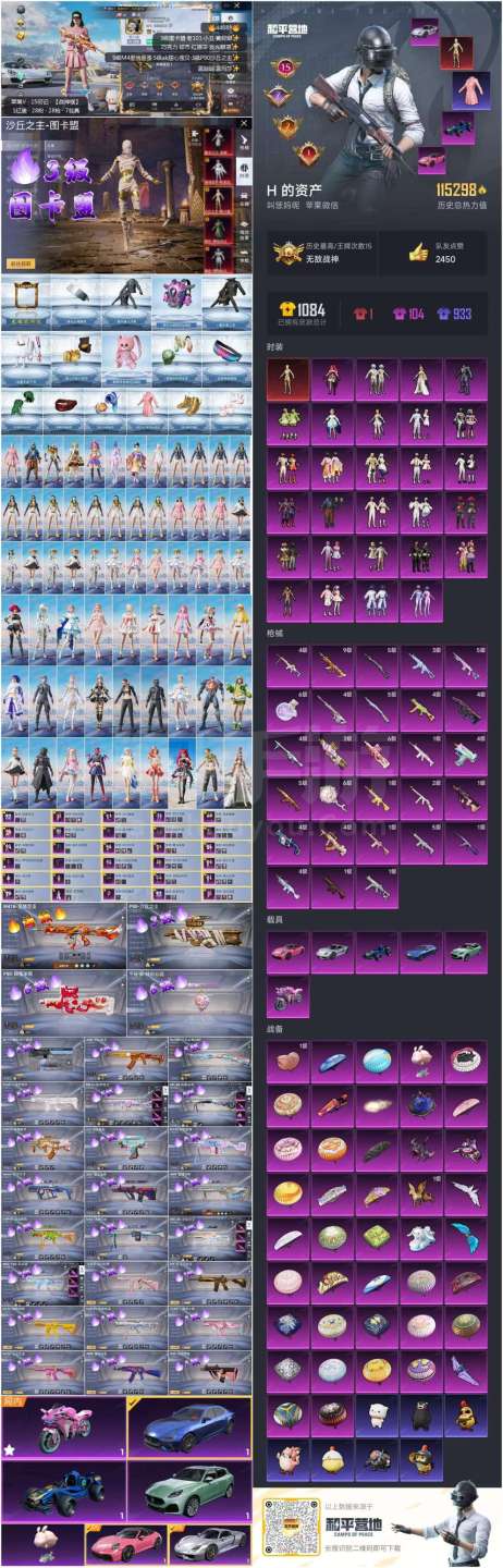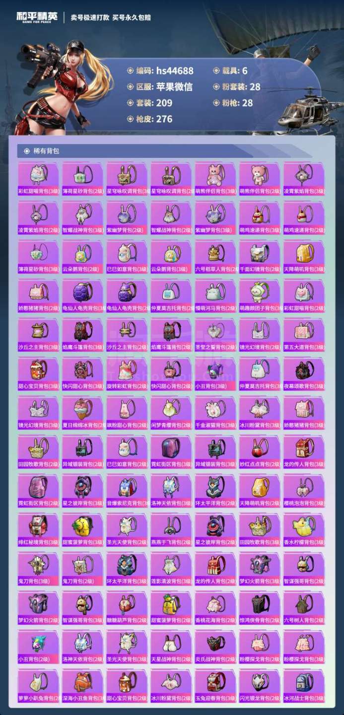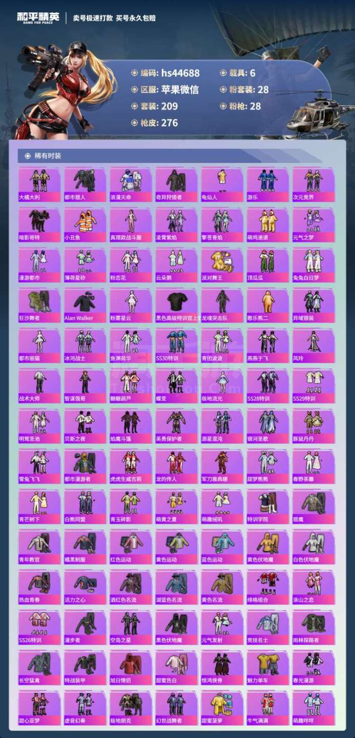 hs44688 苹果微-15王牌印记-有战神框-28粉装-28特效枪-6载具-115298热力值-