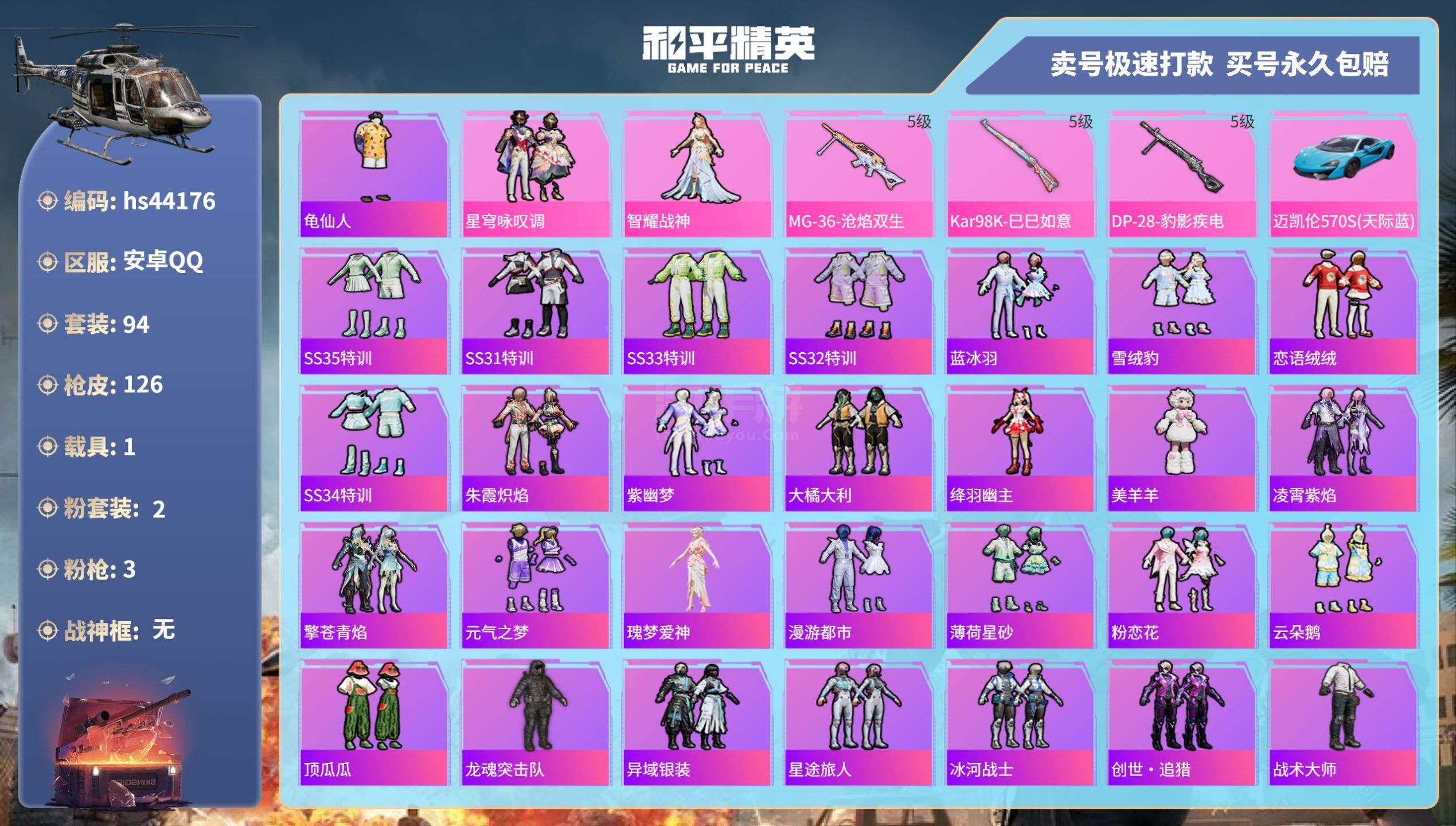 hs44176 安卓手Q-5王牌印记-2粉装-3特效枪-1载具-35412热力值-94套装-126枪