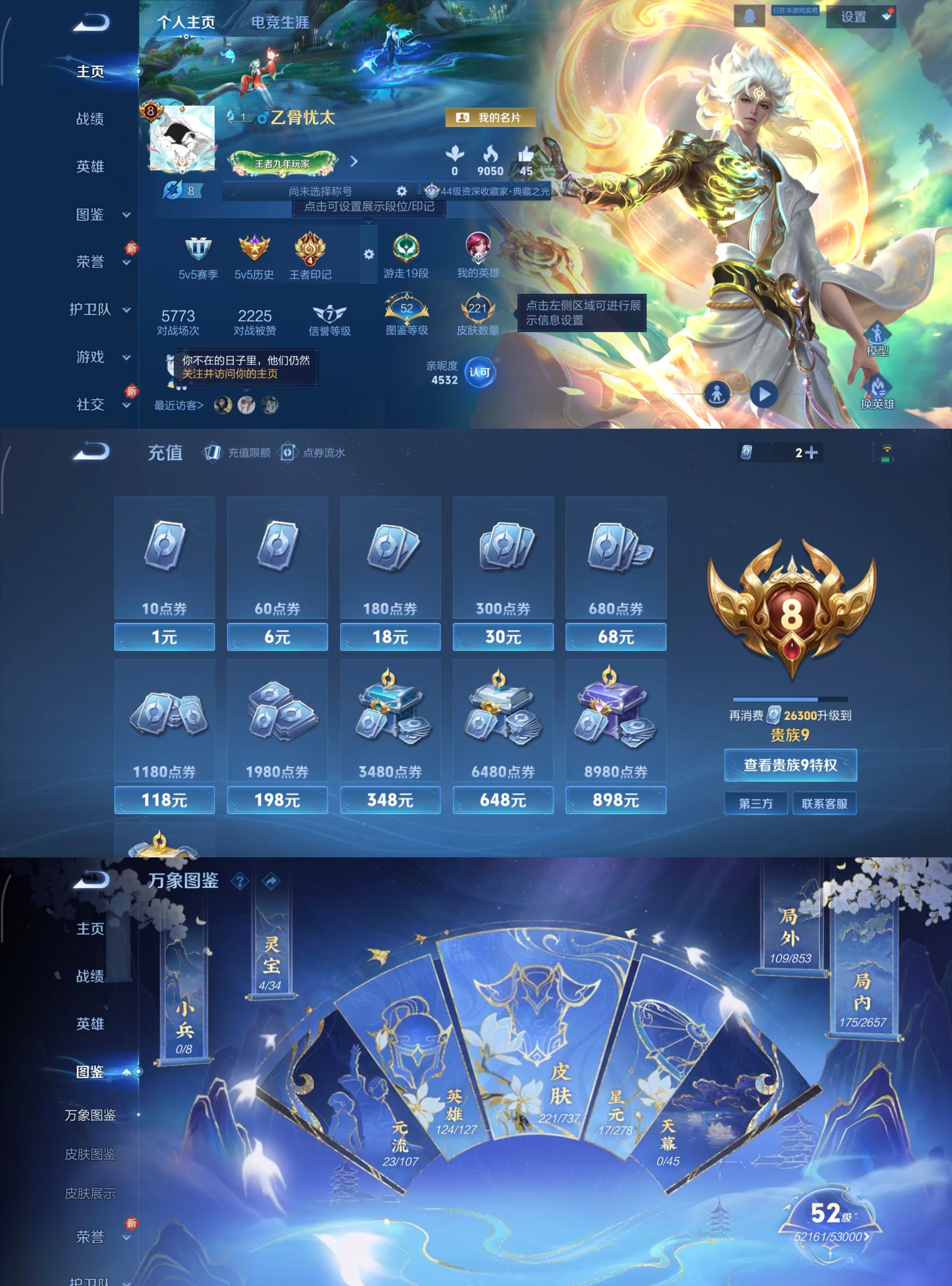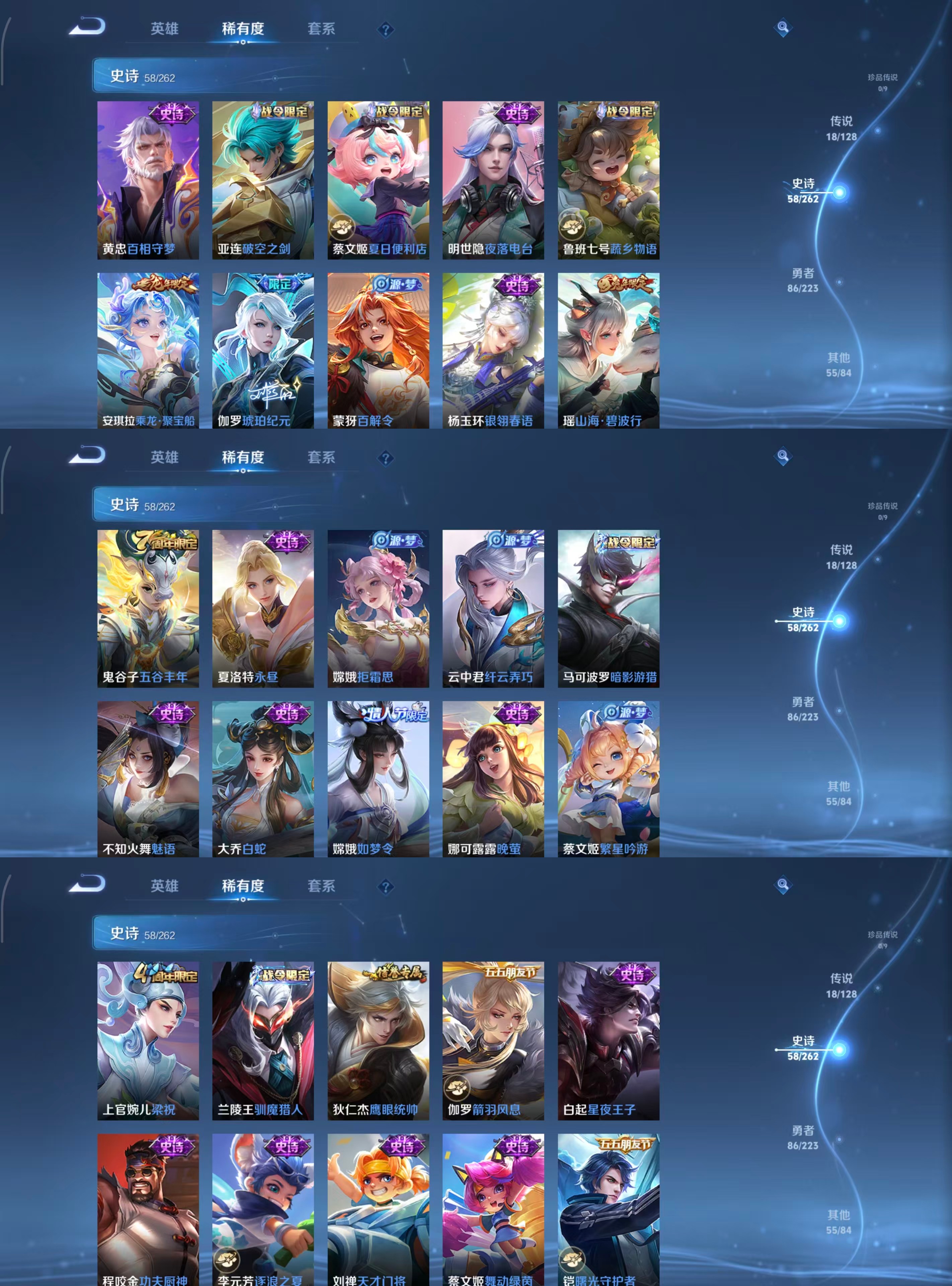 王者荣耀【安卓QQ】皇冠等级 安卓QQ 贵族8 荣耀典藏3 无双1 传说皮肤17 史诗皮肤56 皮肤数量221 皮肤价值