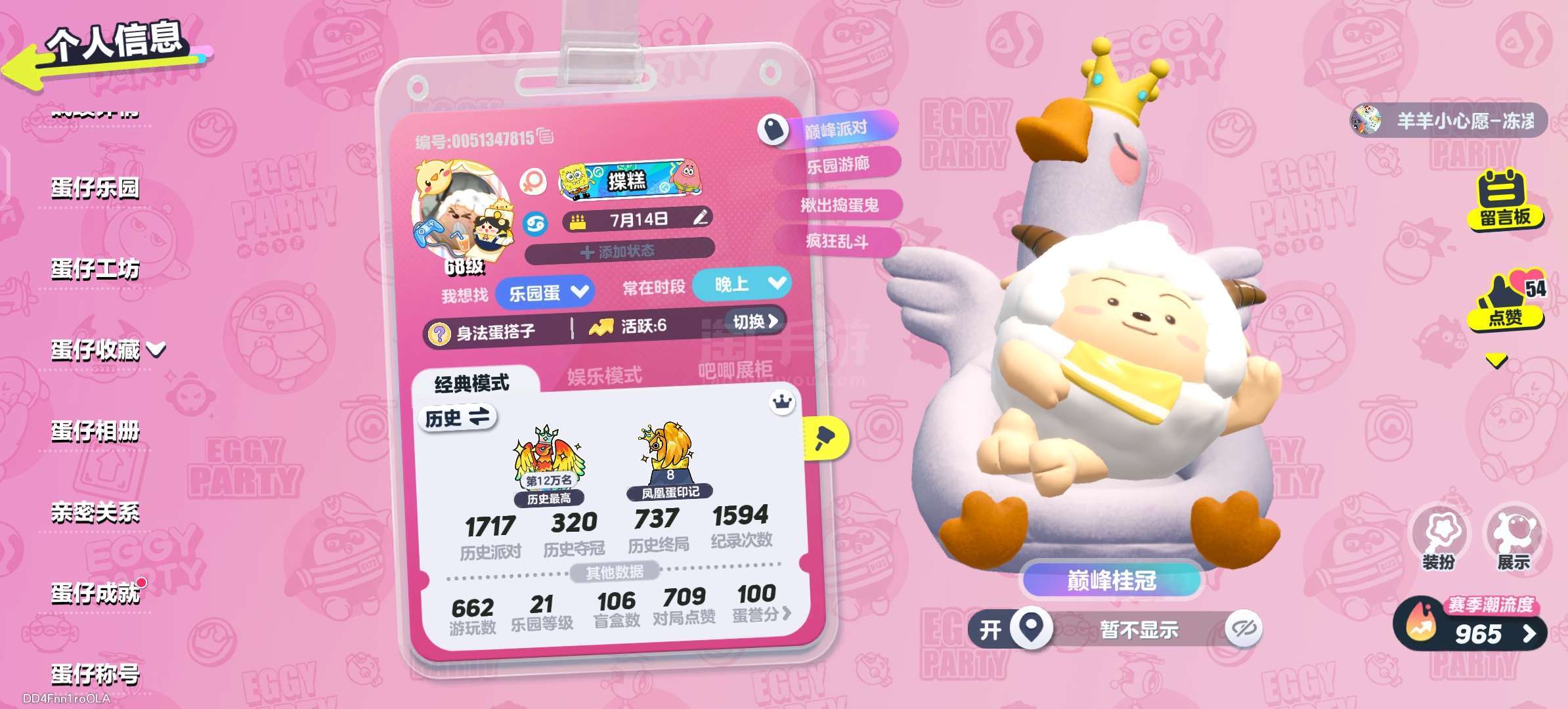 蛋仔派对【安卓vivo】蛋仔双字id老账号,有懒羊羊和汤圆