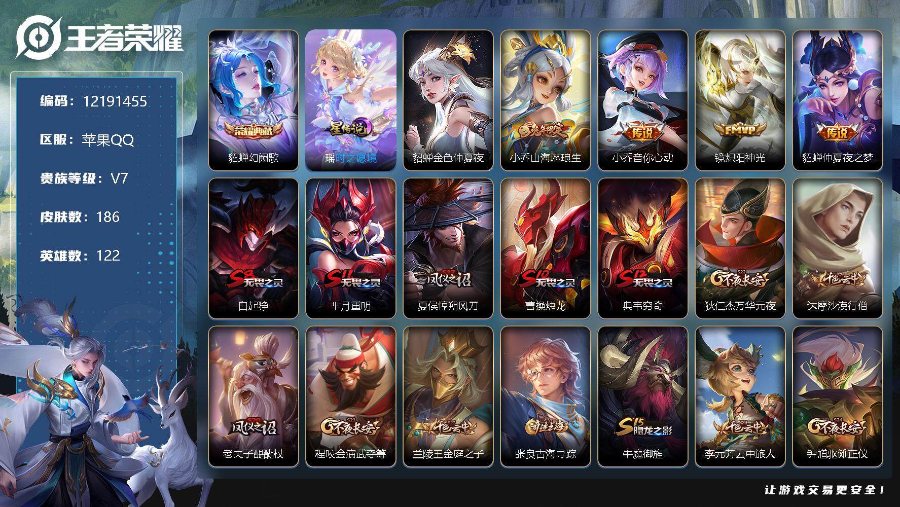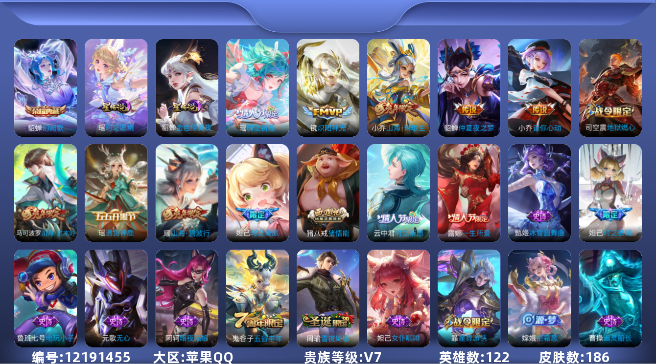 王者荣耀【苹果QQ】【12191455】[12191455]性别: 女号 贵族等级: V7 英雄数
