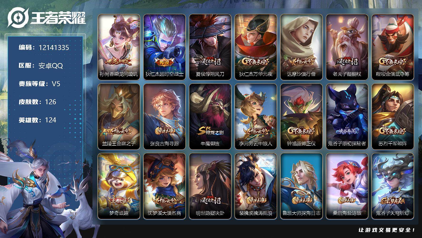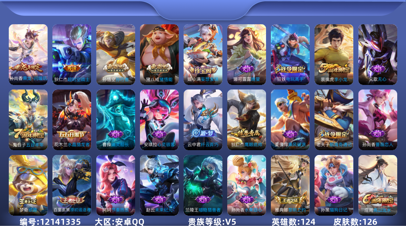 营地账号:1796367056/【12141335】[12141335]实名: 可修改 性别: 男号 贵族等级: V5 英雄数: 124 皮肤数: 126 传说皮: 超时空战士-狄仁杰,乘龙·问璇玑 限定皮: 李小龙,高山流水,孙行者,猪悟能,五谷丰年 亮点: 【店长推荐精品号】126皮2传说40限定精品号,孙尚香龙限,超时空战士孙行者鬼剑武藏等优质皮肤 银标孙策铭文齐全 夺宝115!!(号内有