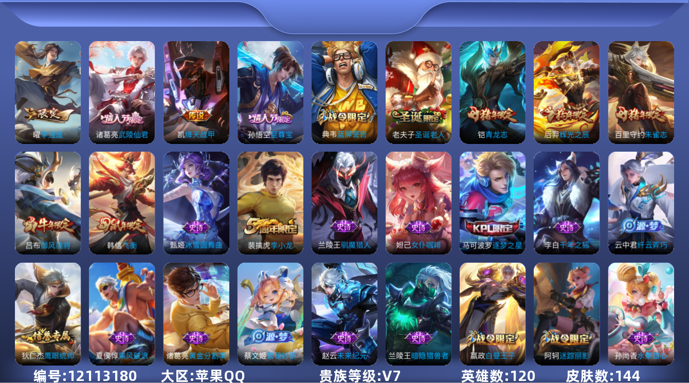营地账号:355617966/【12113180】[12113180]实名: 可修改 性别: 男号 贵族等级: V7 英雄数: 120 皮肤数: 144 传说皮: 绛天战甲,李逍遥 限定皮: 李小龙,御风骁将,辉光之辰,飞衡,逐梦之星,青龙志,朱雀志,至尊宝,武陵仙君,圣诞老人 亮点: 【店长推荐精品号】144皮3传说56限定贵七精品号,曜李逍遥,绛天战甲,武陵仙君 御风骁将 飞衡青龙朱雀志等传