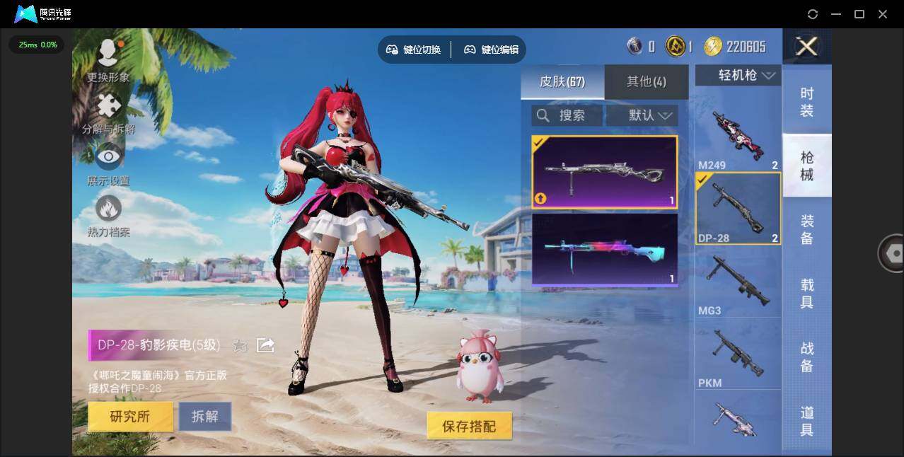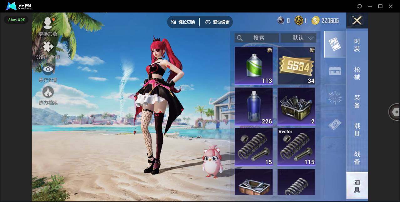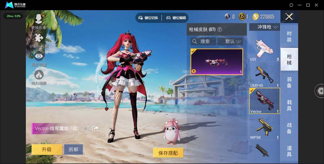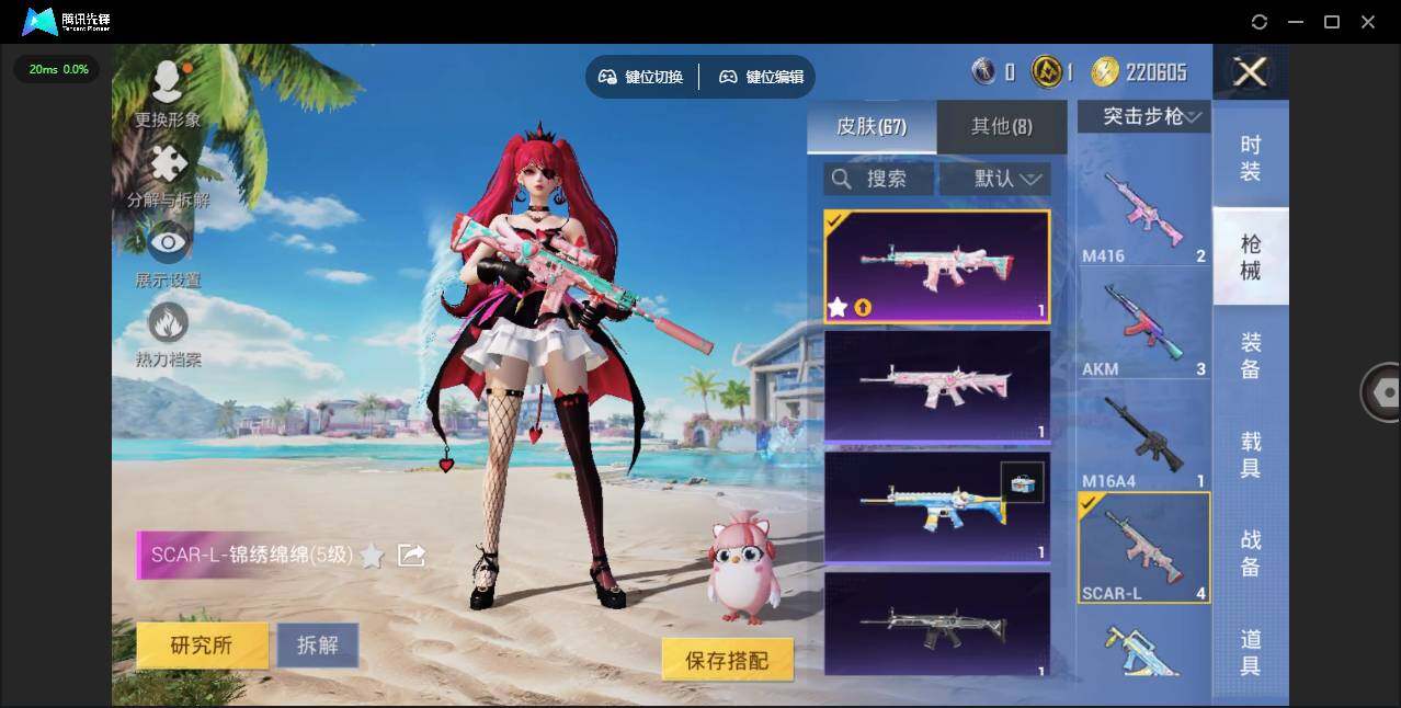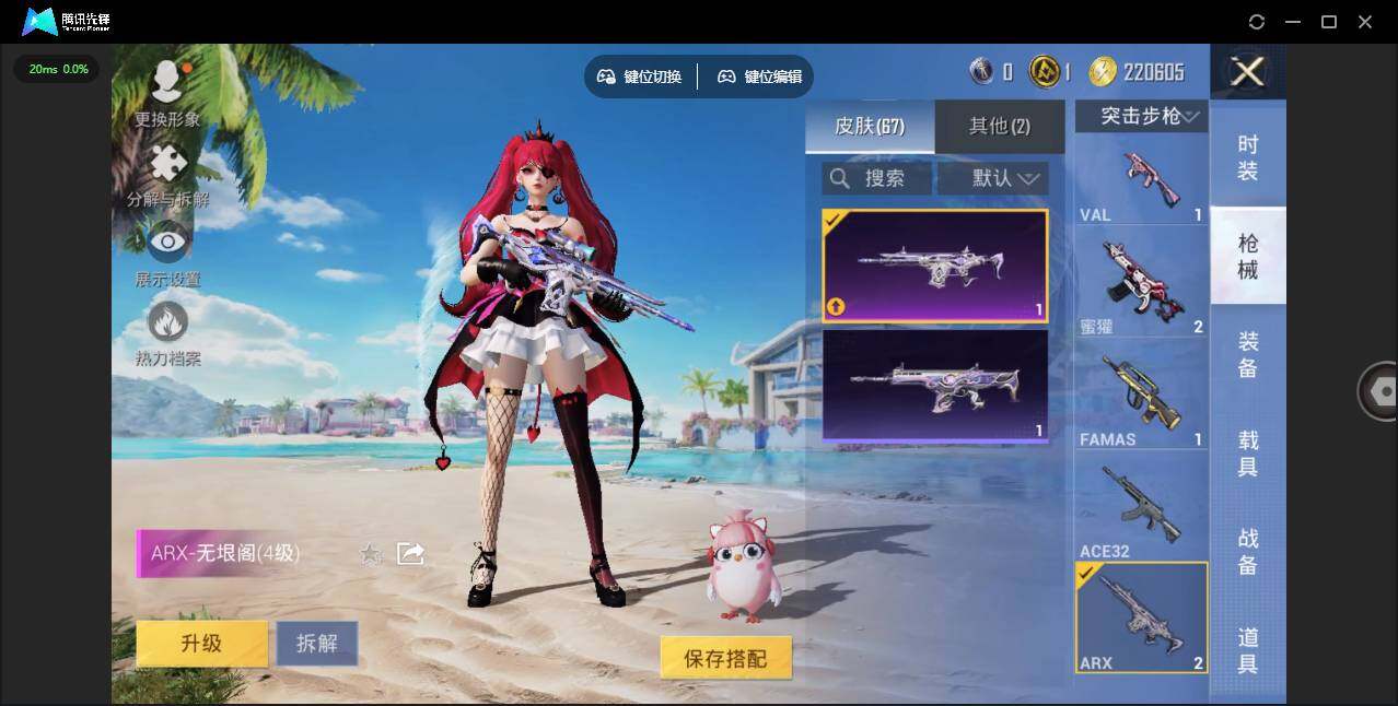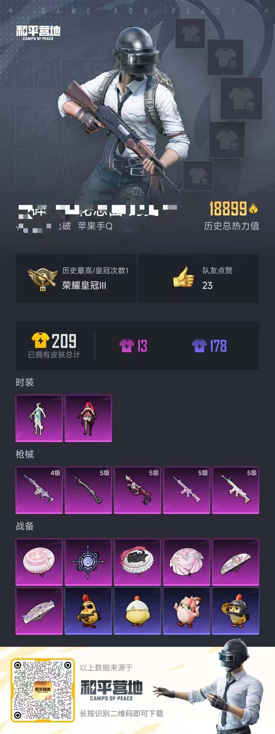时装数: 127 枪械数: 67 战备数: 45 热门装扮: 绯穹魔姬 稀有枪皮: SCAR-L-锦绣绵绵,M416电玩时刻,Vector-绯穹魔姬,ARX-无垠阁,DP-28-豹影疾电