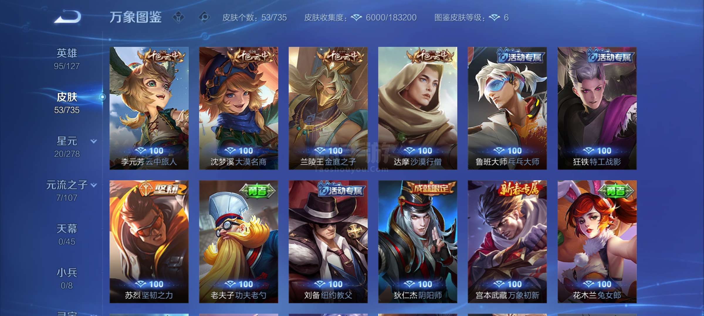 王者荣耀0磕小号县标韩信卓手Q416区54皮0典藏0传说0无双