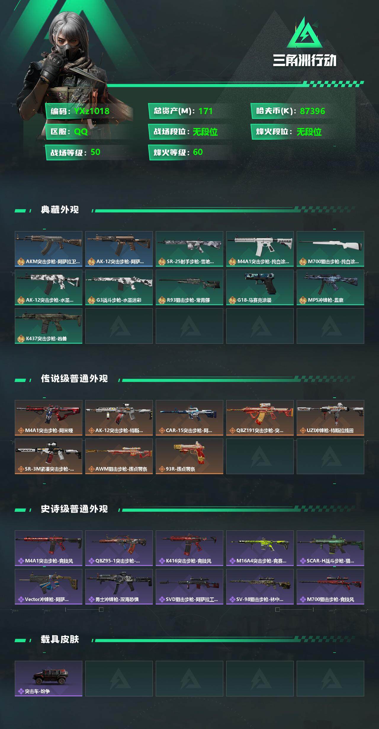 【Q区三端互通】【无二次】YXz1018-特勤处:仓库7级/训练中心6级/靶场6级-总资产171.9M-哈夫币8739W-烽火等级:60级【勾选了部分账号,详细看图,平台认证商家店铺,保证金商家,安全有保障,性价比超高,永久包赔】【典藏外观】:AKM突击步枪-阿萨拉卫队,AK-12突击步枪-阿萨拉卫队,SR-25射手步枪-雪地迷彩,M4A1突击步枪-纯白涂装,M700狙击步枪-纯白涂装,AK-1
