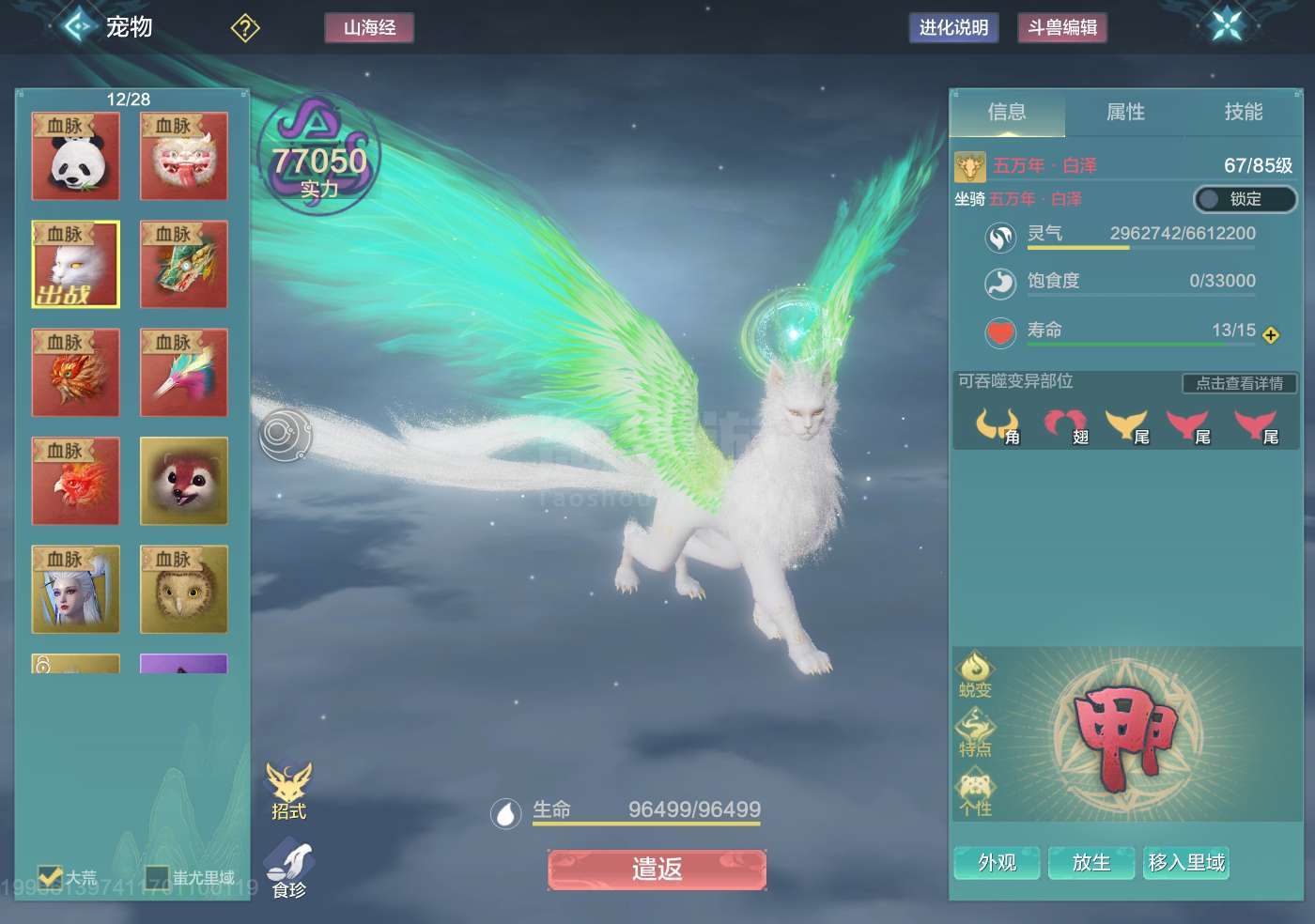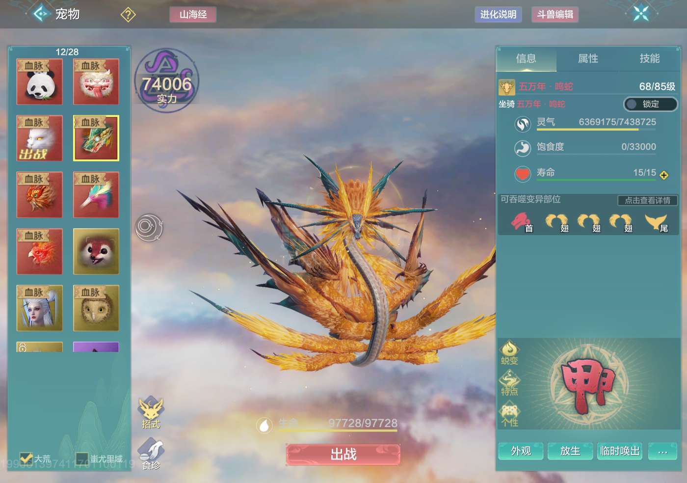 妄想山海【安卓QQ】12万战力,6个五万年宠物,一个偏转野宠,熊猫 毕方 白泽 螭吻 鸣蛇,侍从兔媛媛