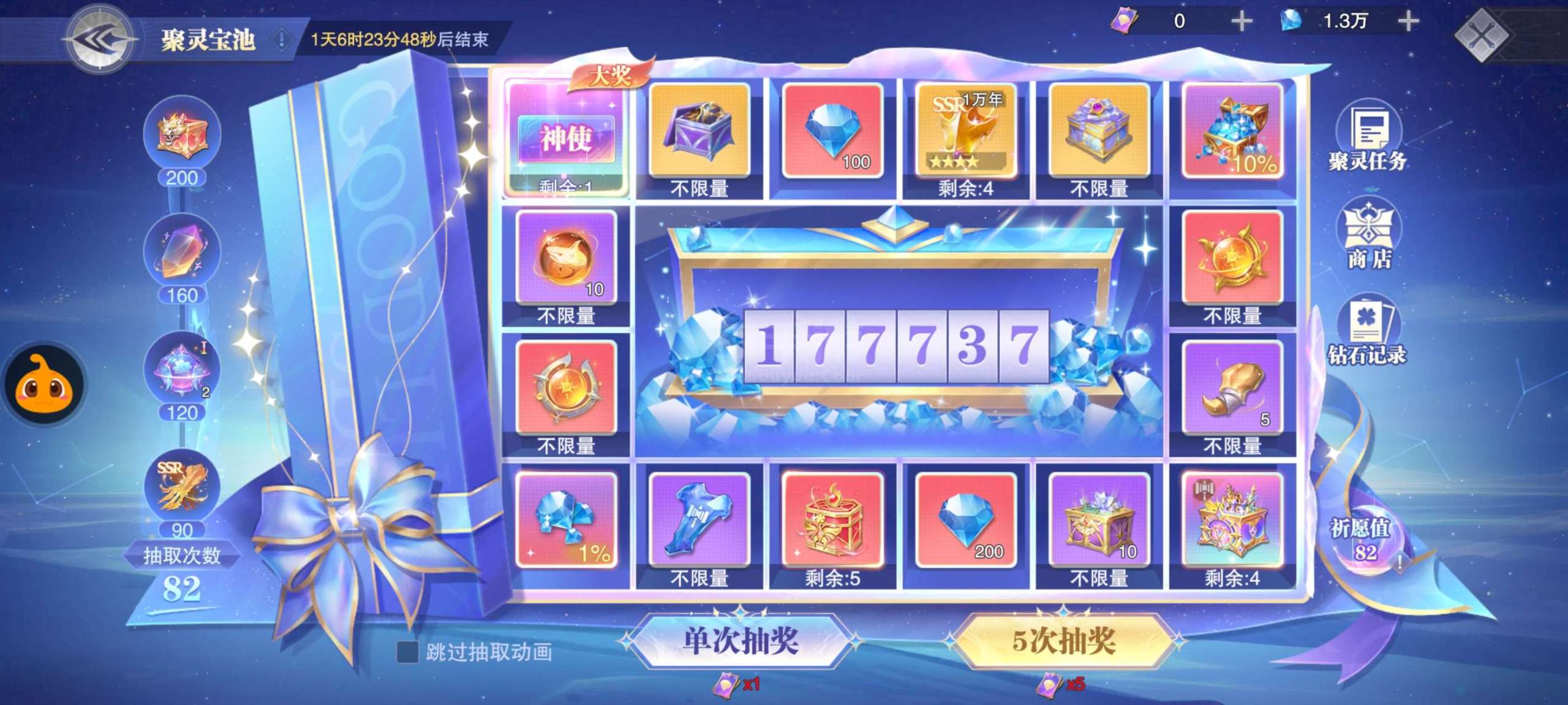 有30极速直升宗师礼包,有1个修罗神环,有ssr+自选,聚灵宝池活动很欧,3次获得1700钻石。