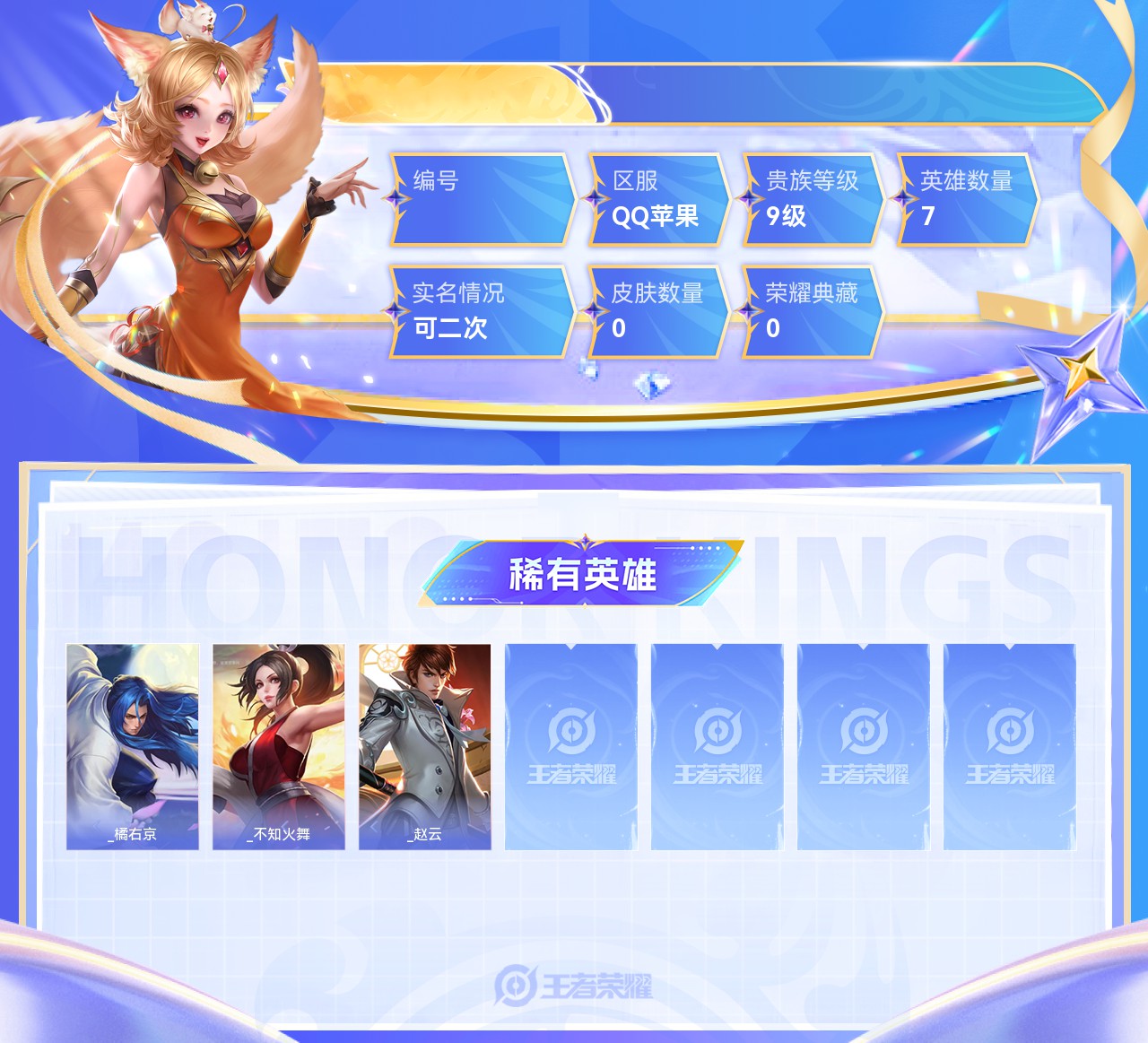 王者荣耀【安卓QQ】英雄7 皮肤0 稀有英雄3 贵族9级 总场次116 皮
