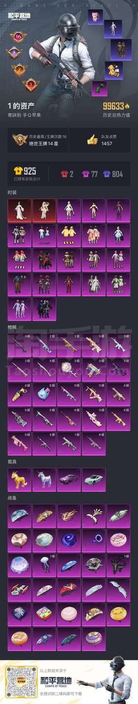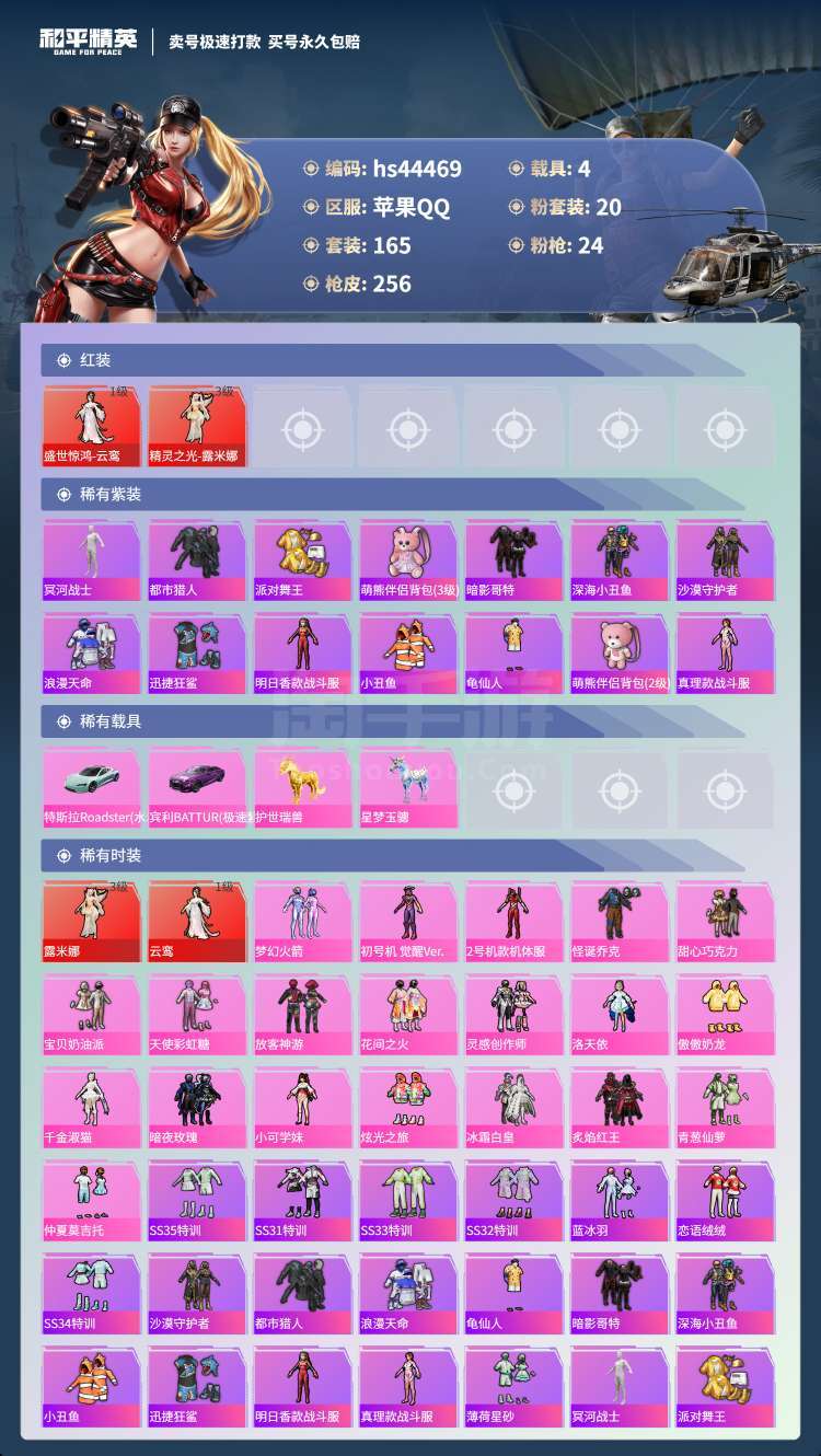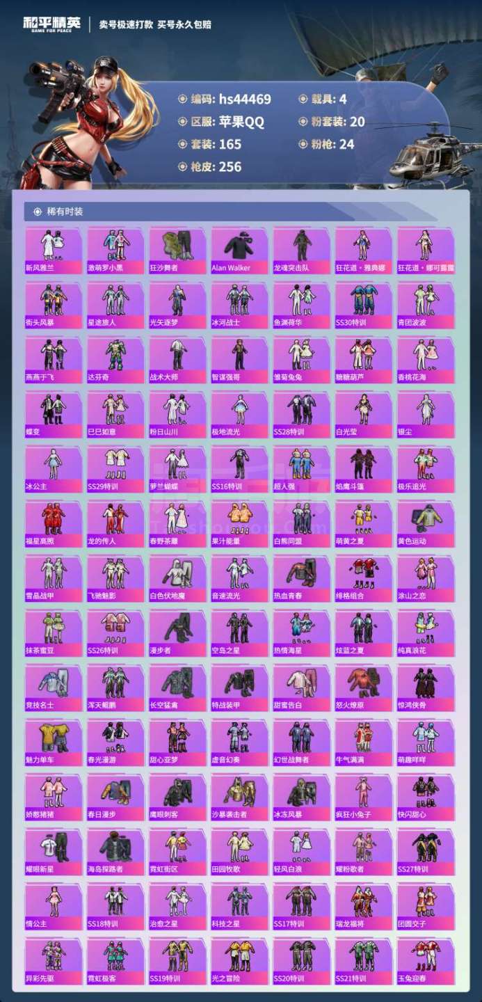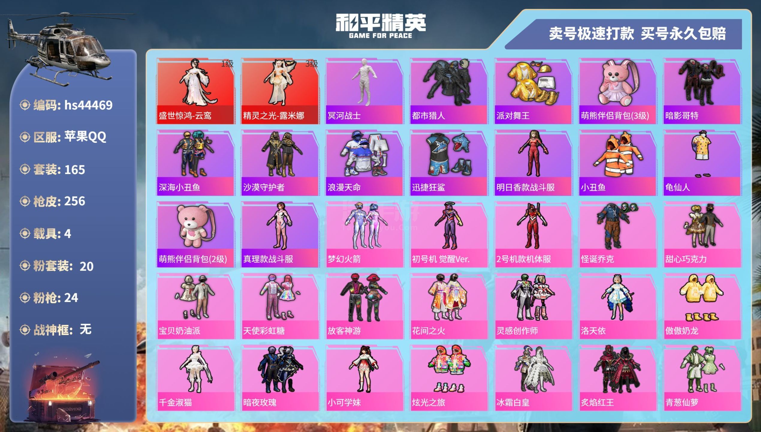 hs44469 苹果手Q-16王牌印记-20粉装-24特效枪-4载具-100259热力值-165套装