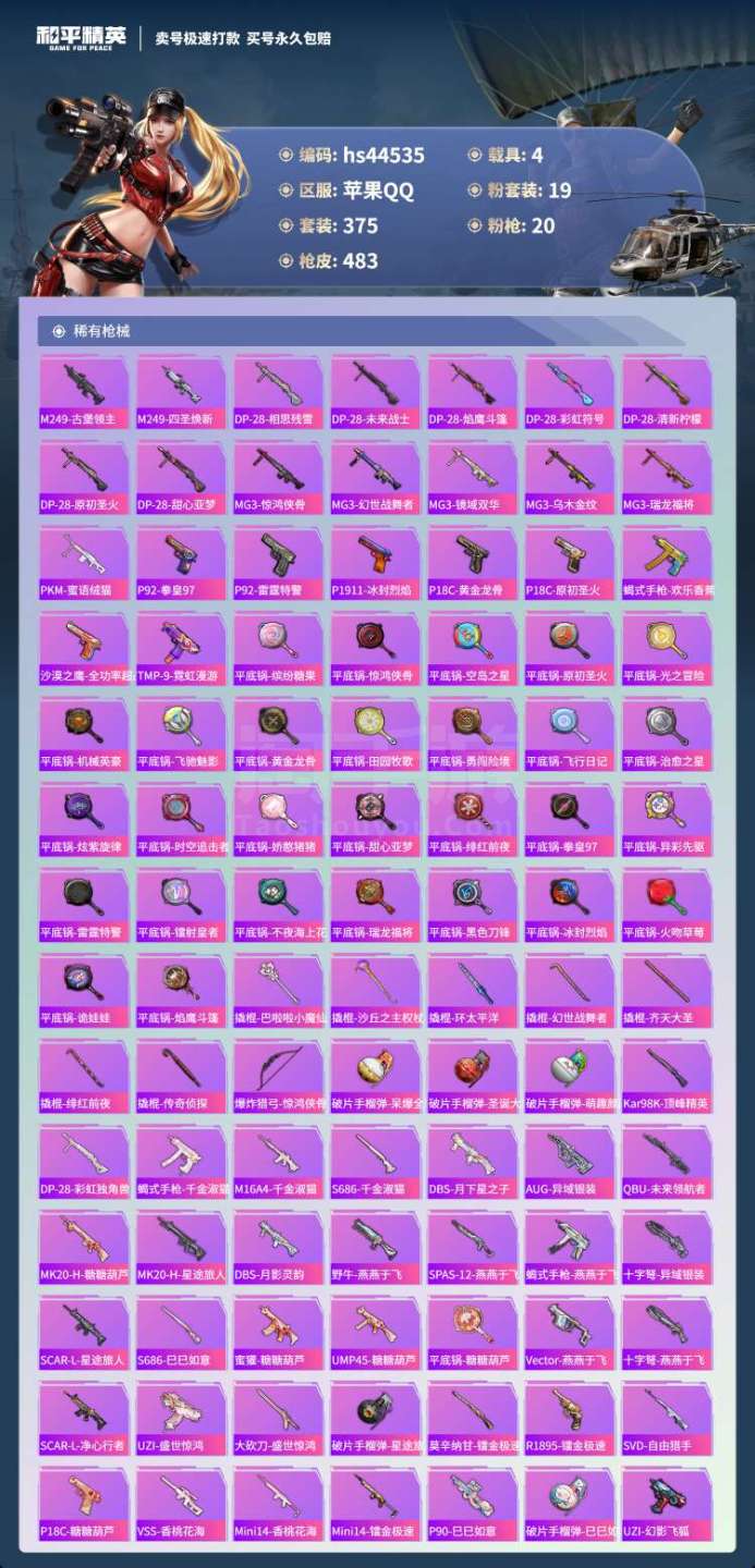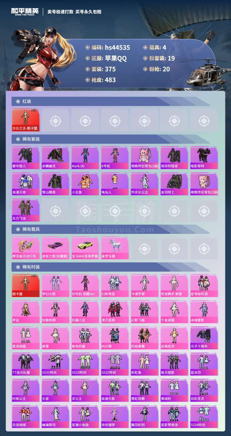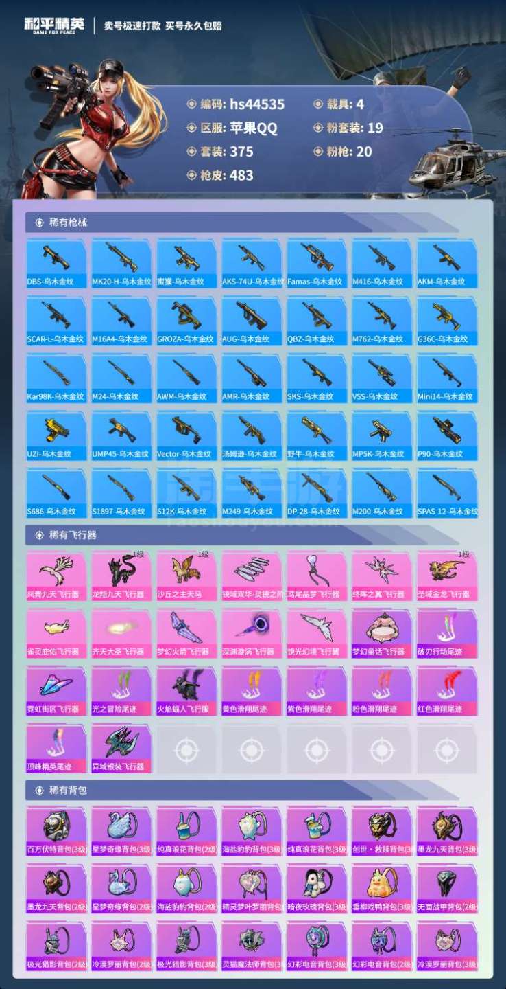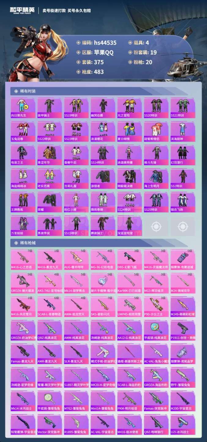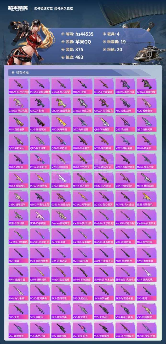 hs44535 苹果手Q-17王牌印记-19粉装-20特效枪-4载具-164070热力值-375套装