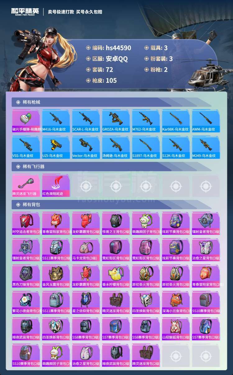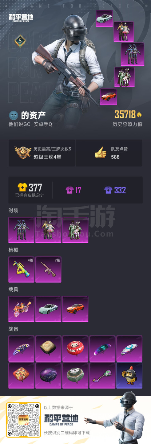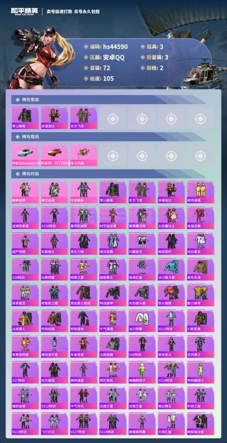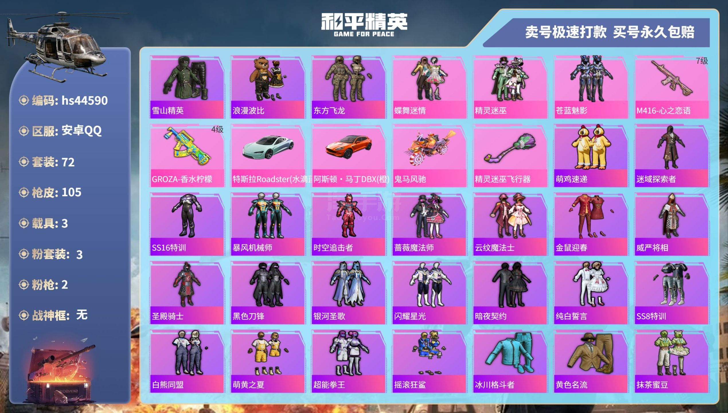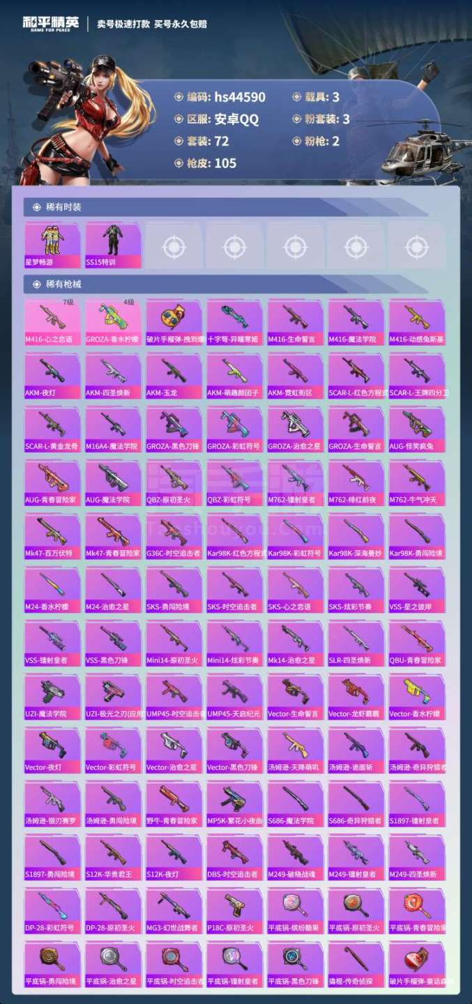 hs44590 安卓手Q-5王牌印记-3粉装-2特效枪-3载具-35718热力值-72套装-105枪