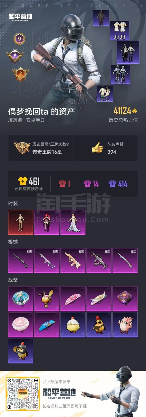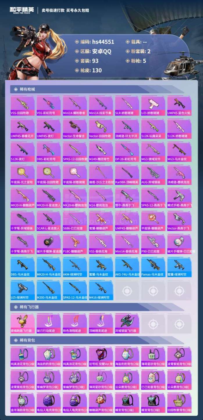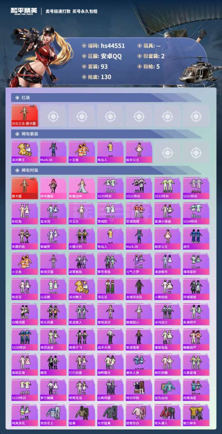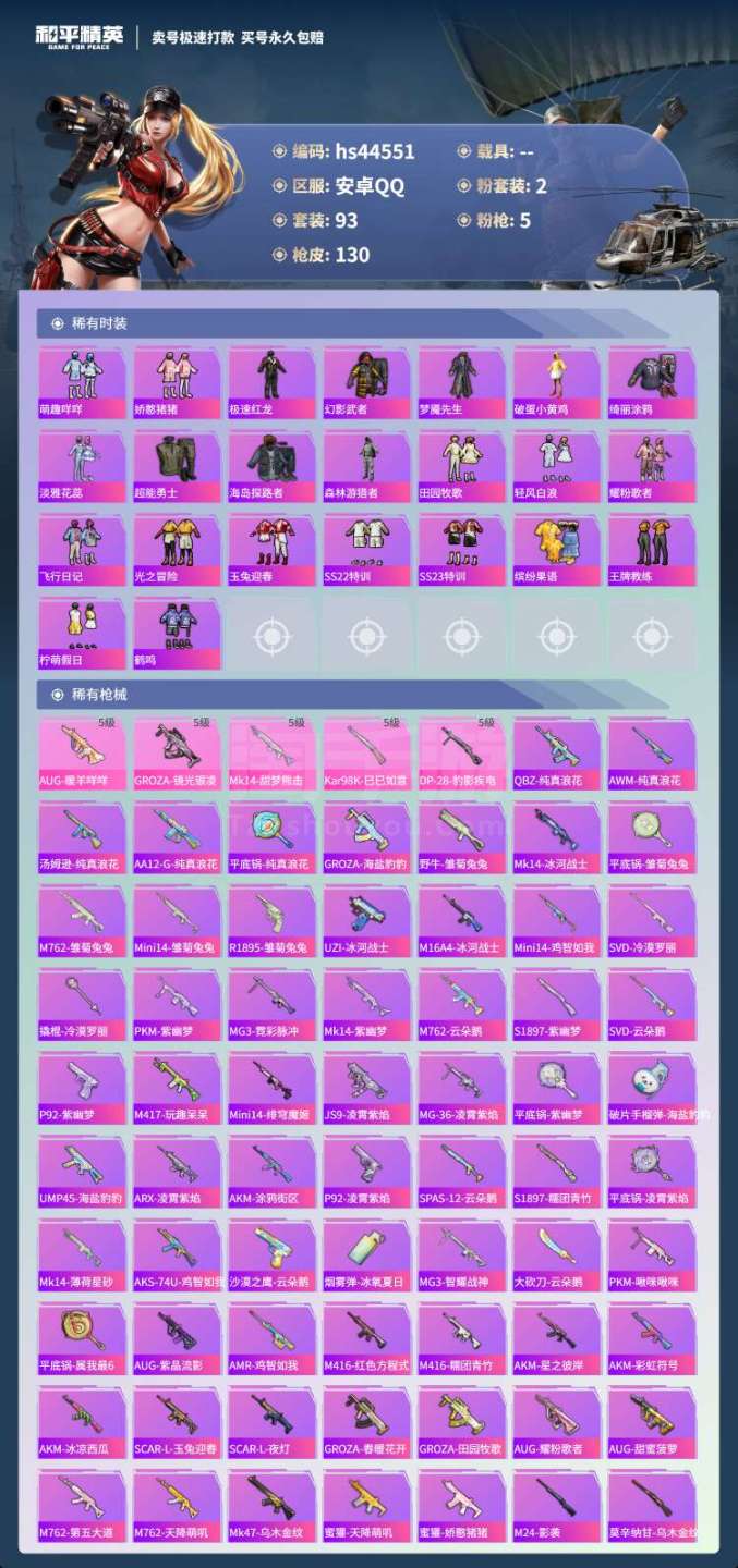 hs44551 安卓手Q-9王牌印记-2粉装-5特效枪-0载具-41124热力值-93套装-130枪
