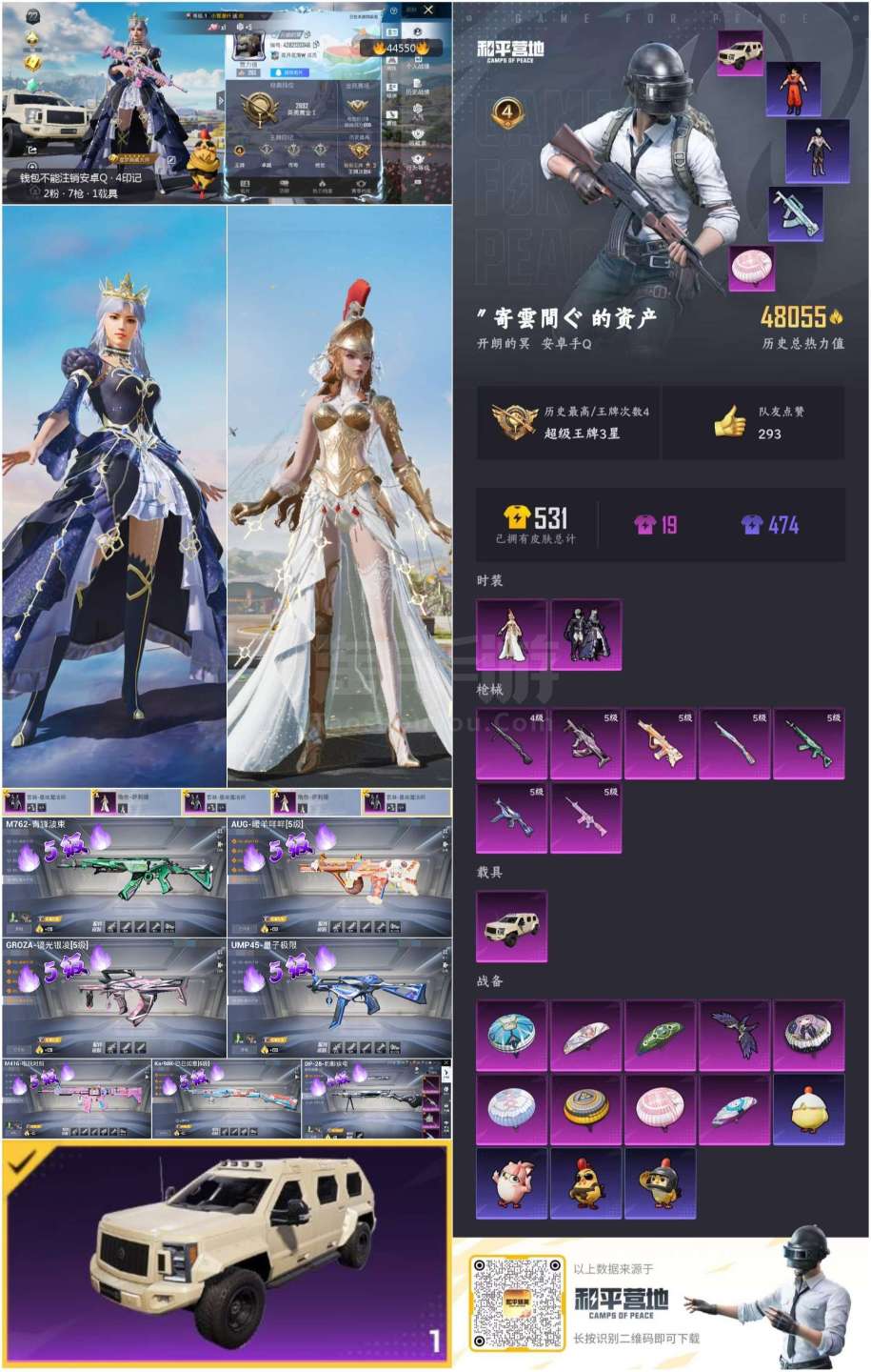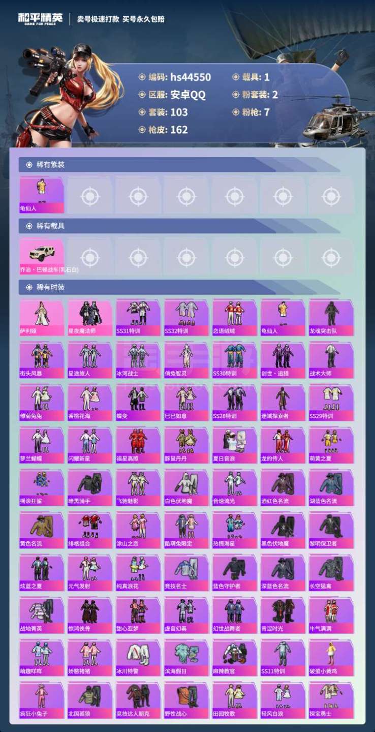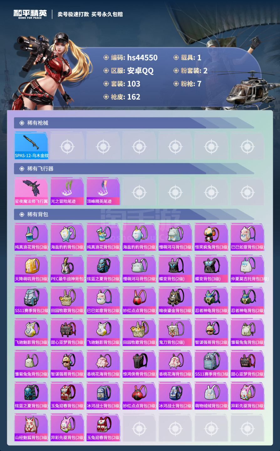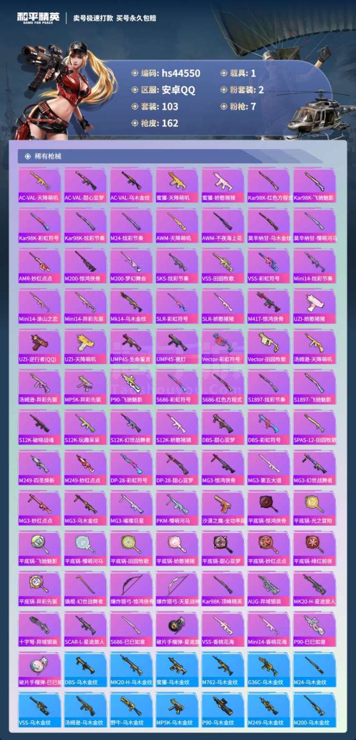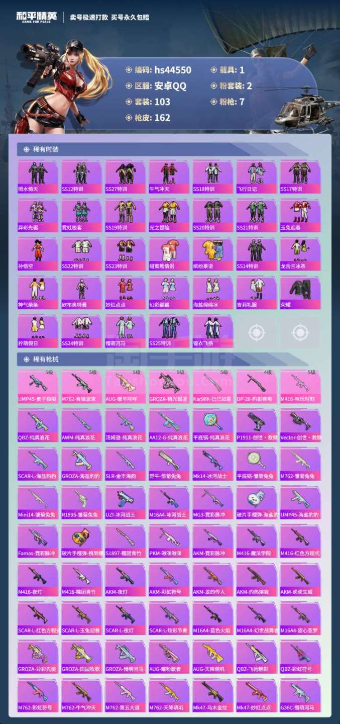 hs44550 安卓手Q-4王牌印记-2粉装-7特效枪-1载具-48060热力值-103套装-162