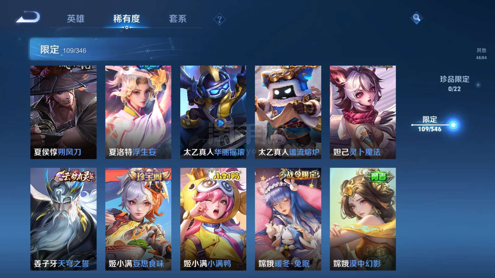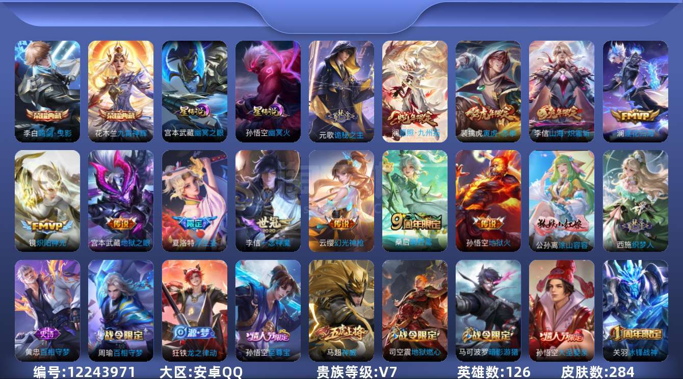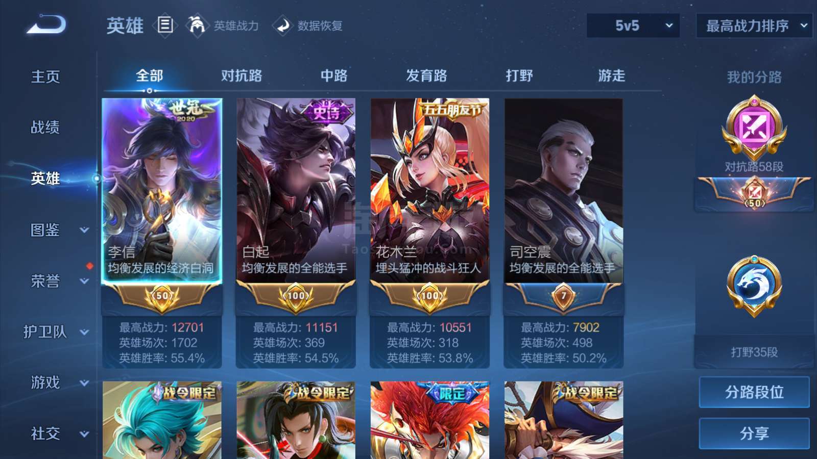 284皮肤2典藏12传说 对抗路58段 打野35段 金标李信 金标白起 金标花木兰 2星传说 幽冥火
