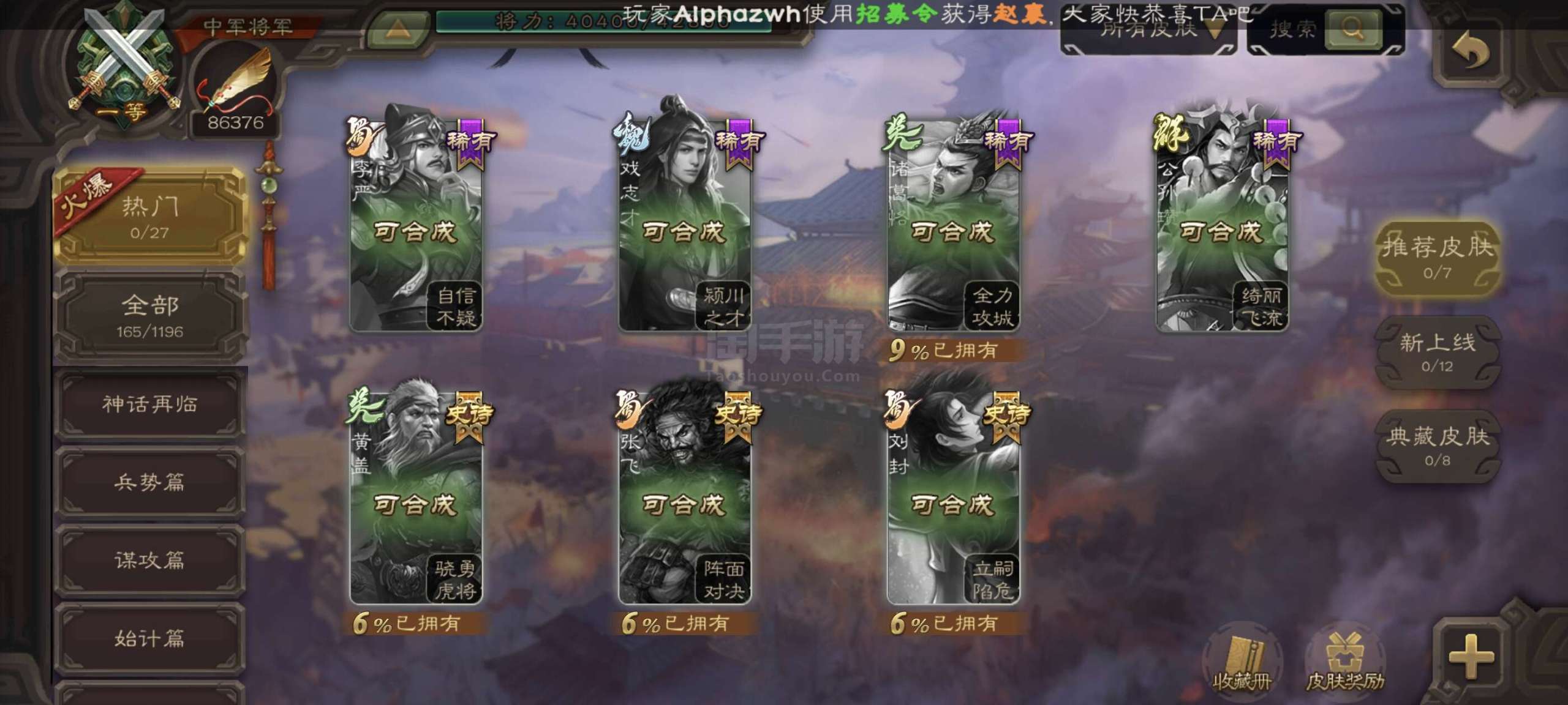 大宝橘子妹团长白马戏子,还有军八女王谋黄月英 7600浆糊9.3w毛可换神赵+动皮活绑天子令已开