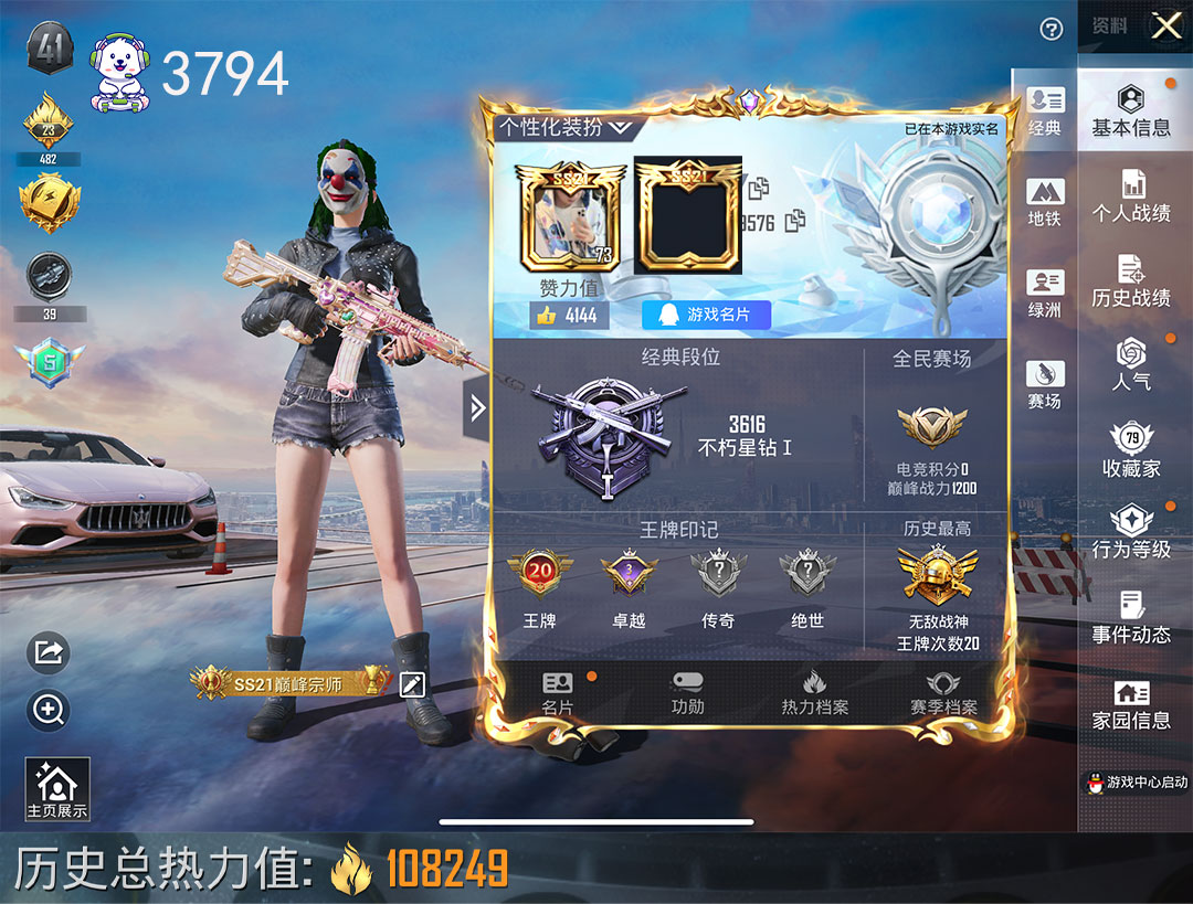 和平精英【苹果QQ】战神框3车13枪15粉盖世英雄9级梦幻小丑猪妹