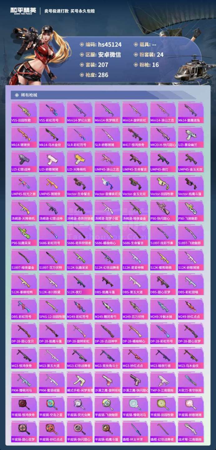 hs45124 安卓微-16王牌印记-24粉装-16特效枪-0载具-112541热力值-207套装