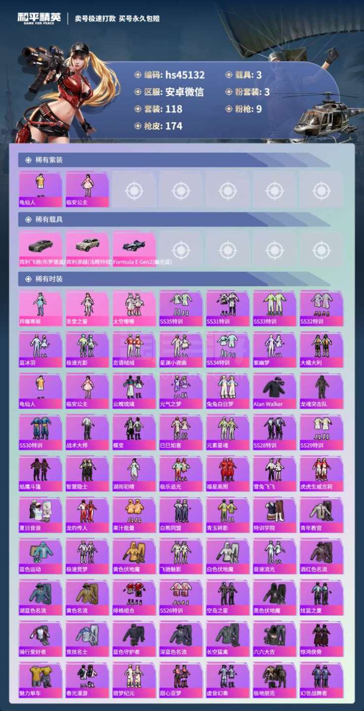 hs45132 安卓微-4王牌印记-3粉装-9特效枪-3载具-54119热力值-118套装-174