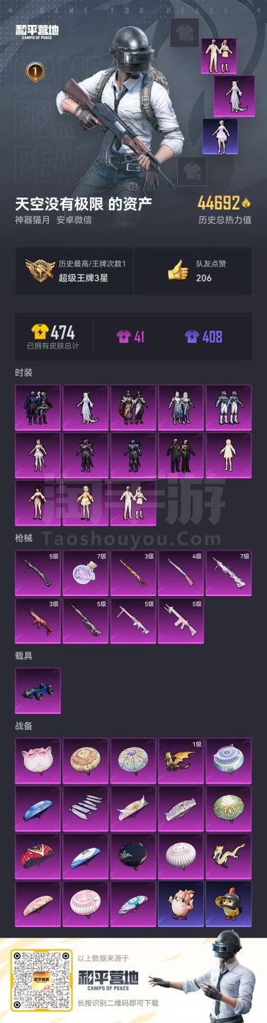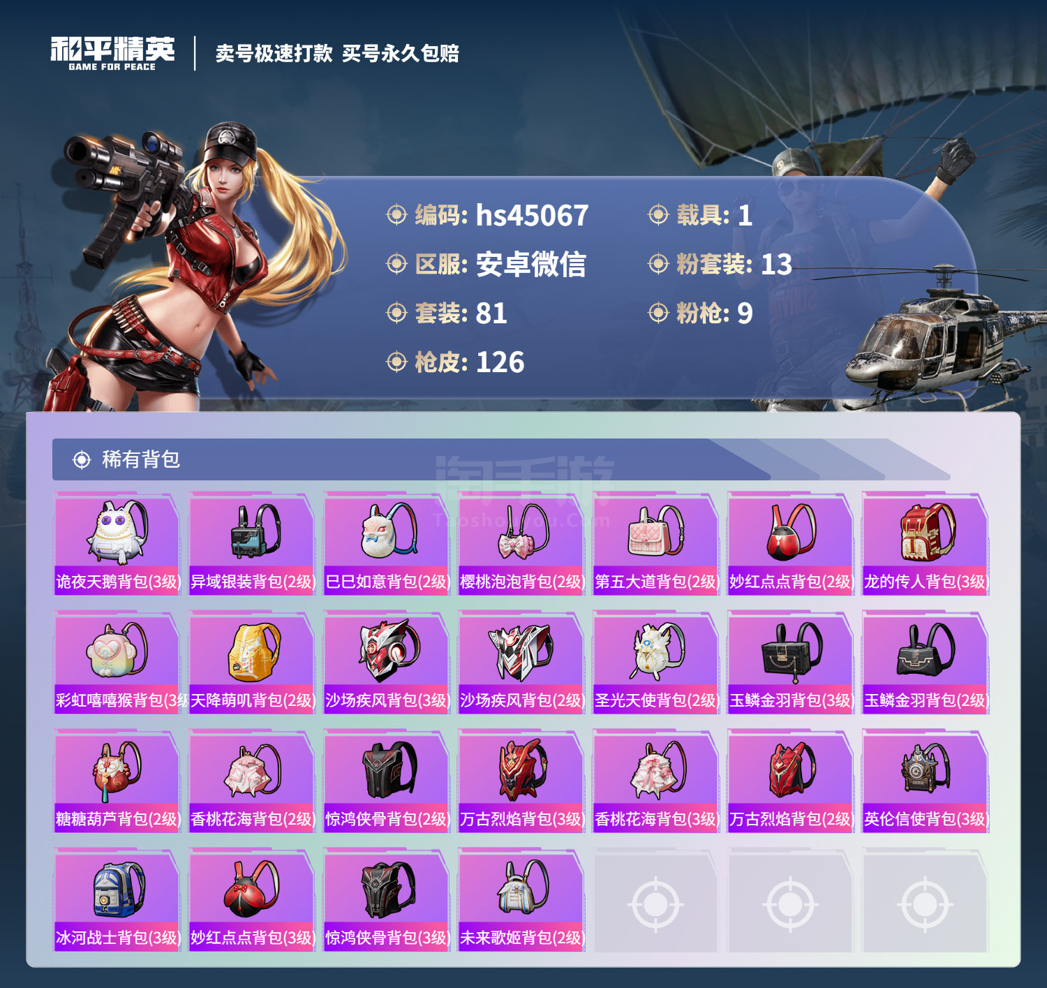 hs45067 安卓微-1王牌印记-13粉装-9特效枪-1载具-44692热力值-81套装-126