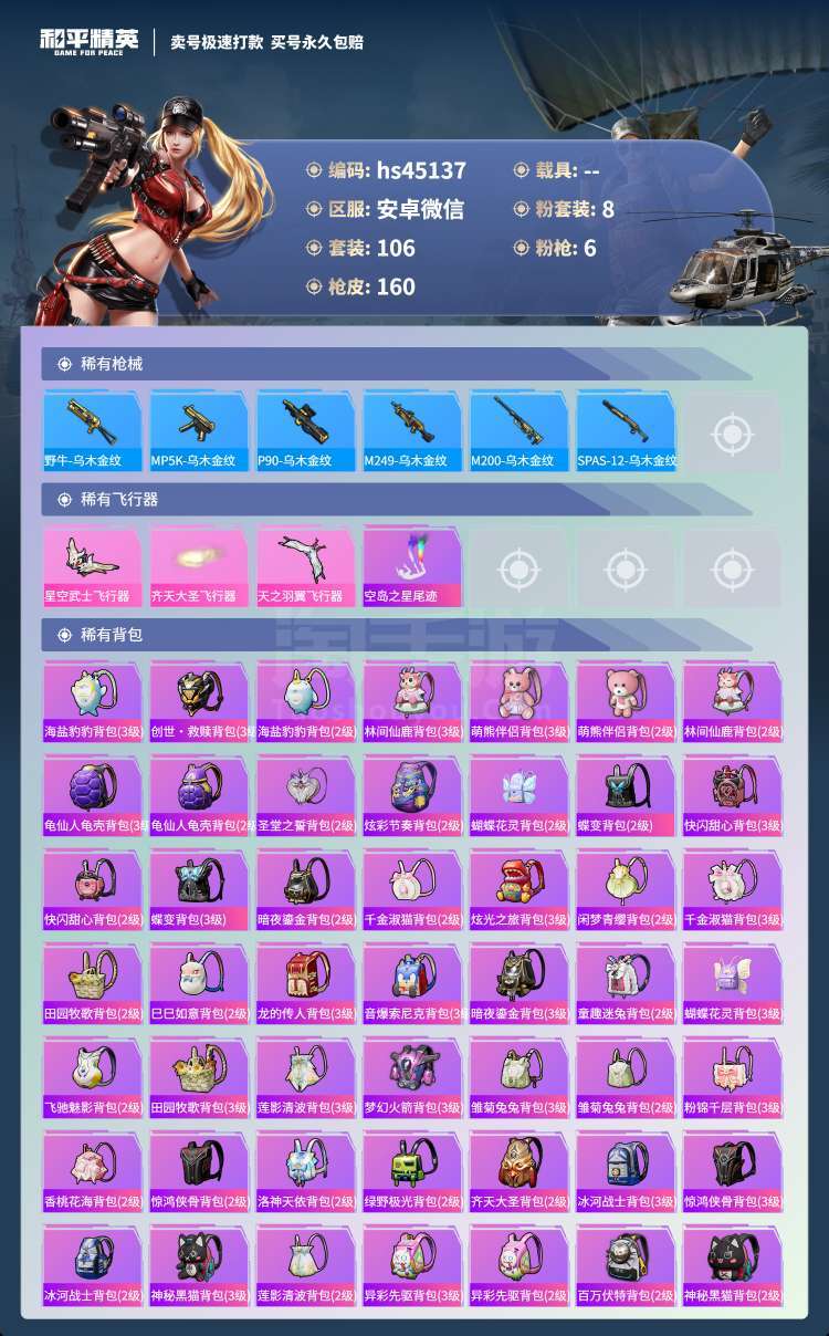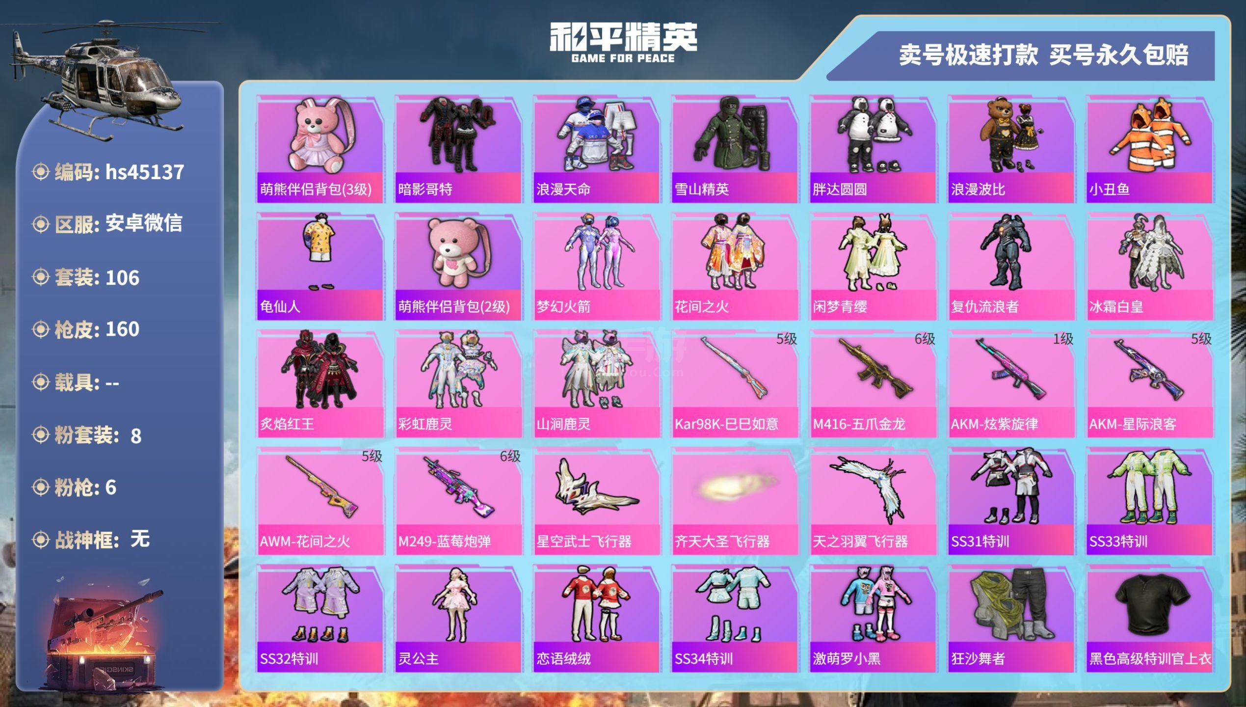 hs45137 安卓微-4王牌印记-8粉装-6特效枪-0载具-48369热力值-106套装-160