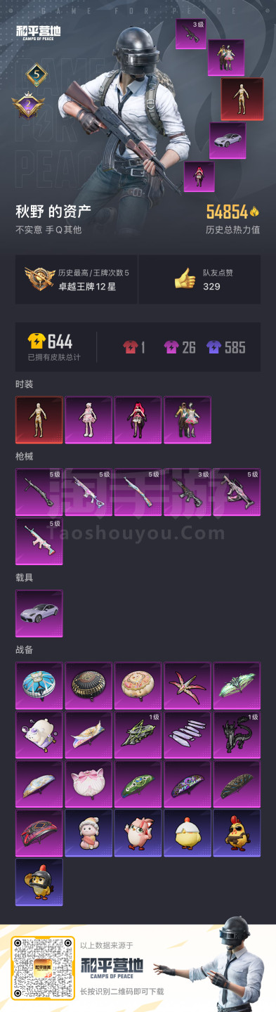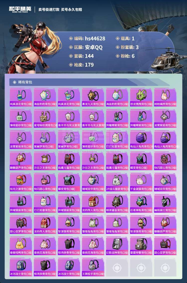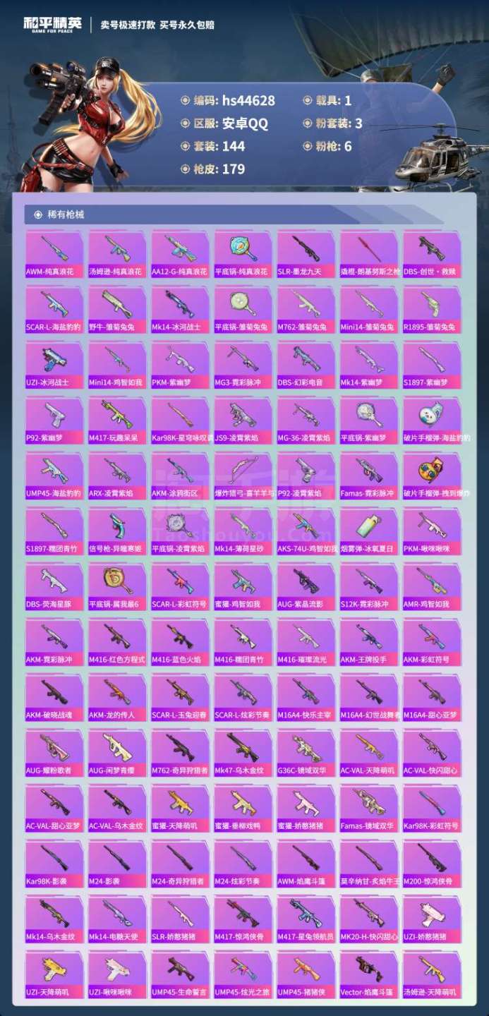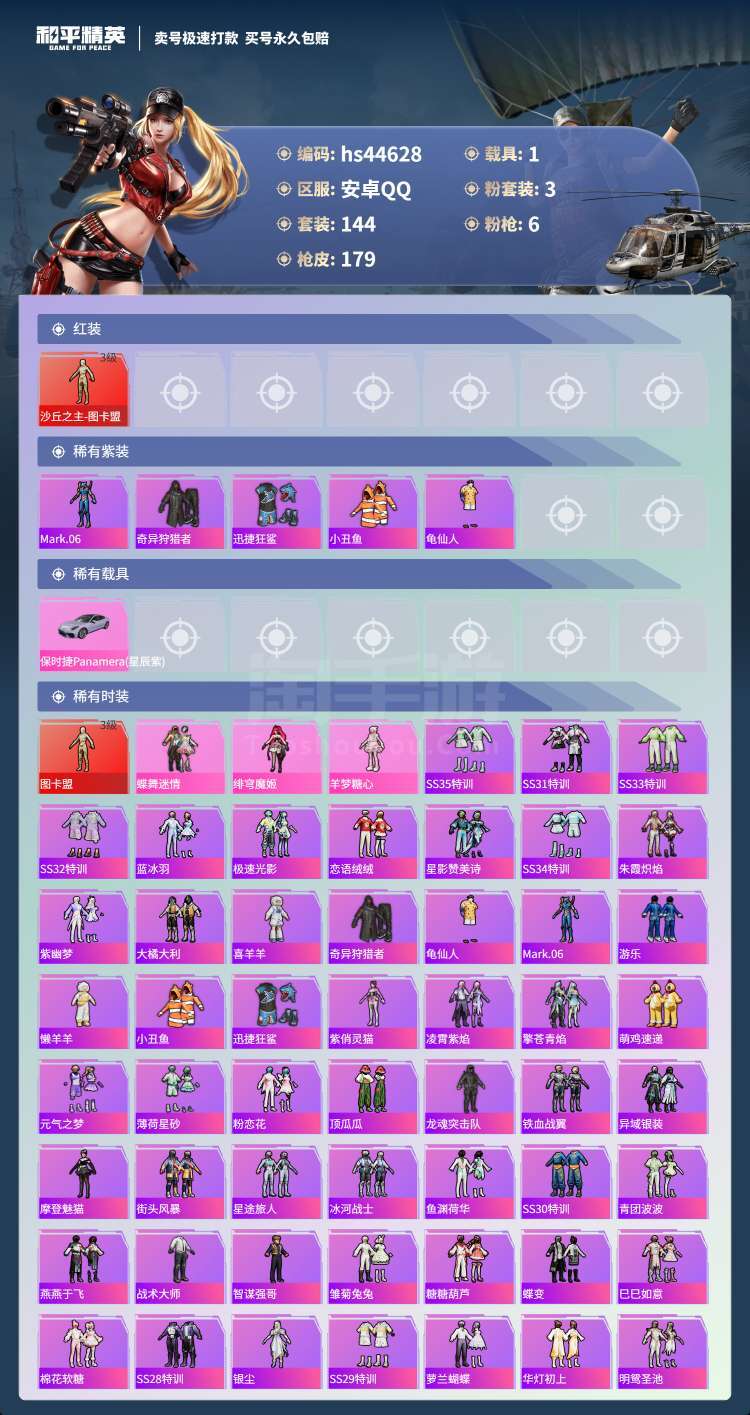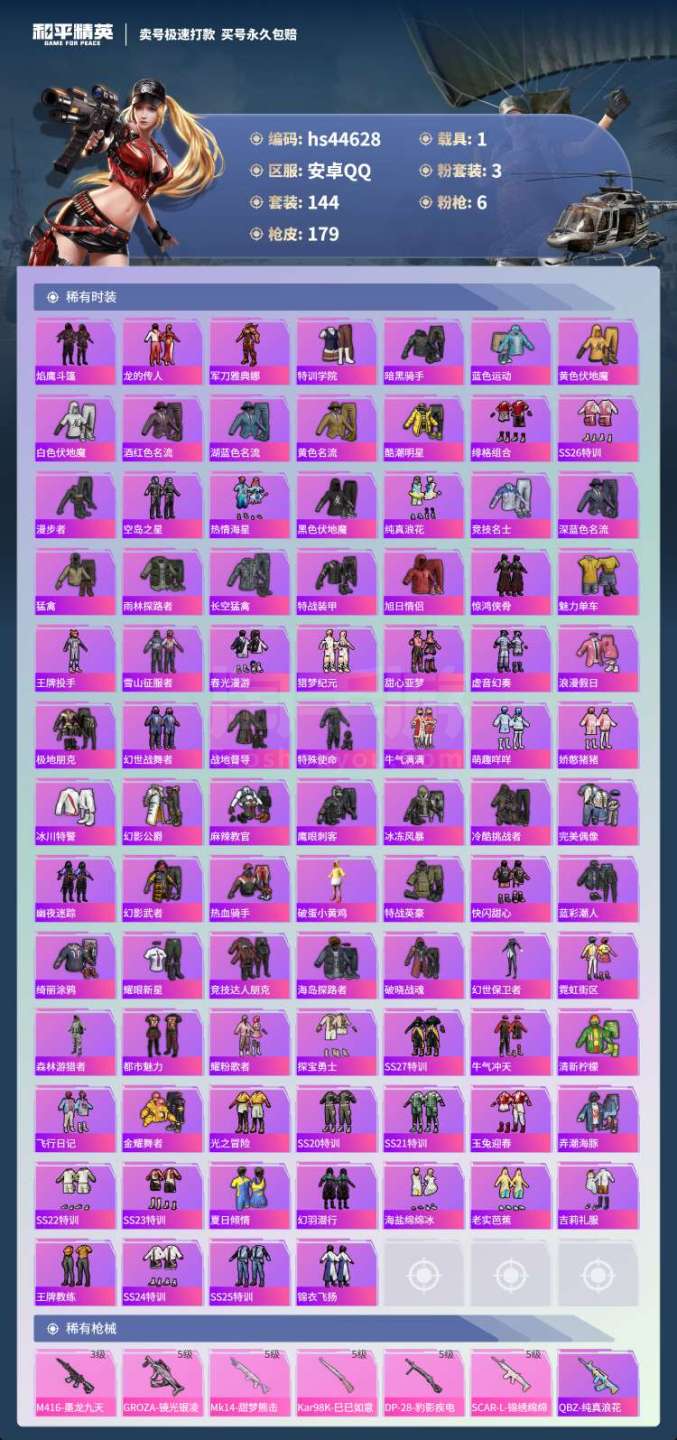 hs44628 安卓手Q-5王牌印记-3粉装-6特效枪-1载具-54854热力值-144套装-179