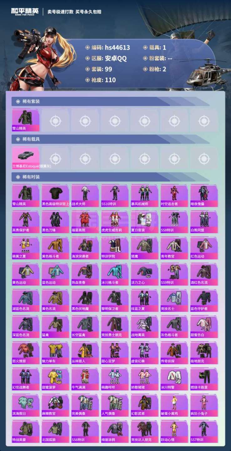 hs44613 安卓手Q-3王牌印记-0粉装-2特效枪-1载具-31869热力值-99套装-110枪