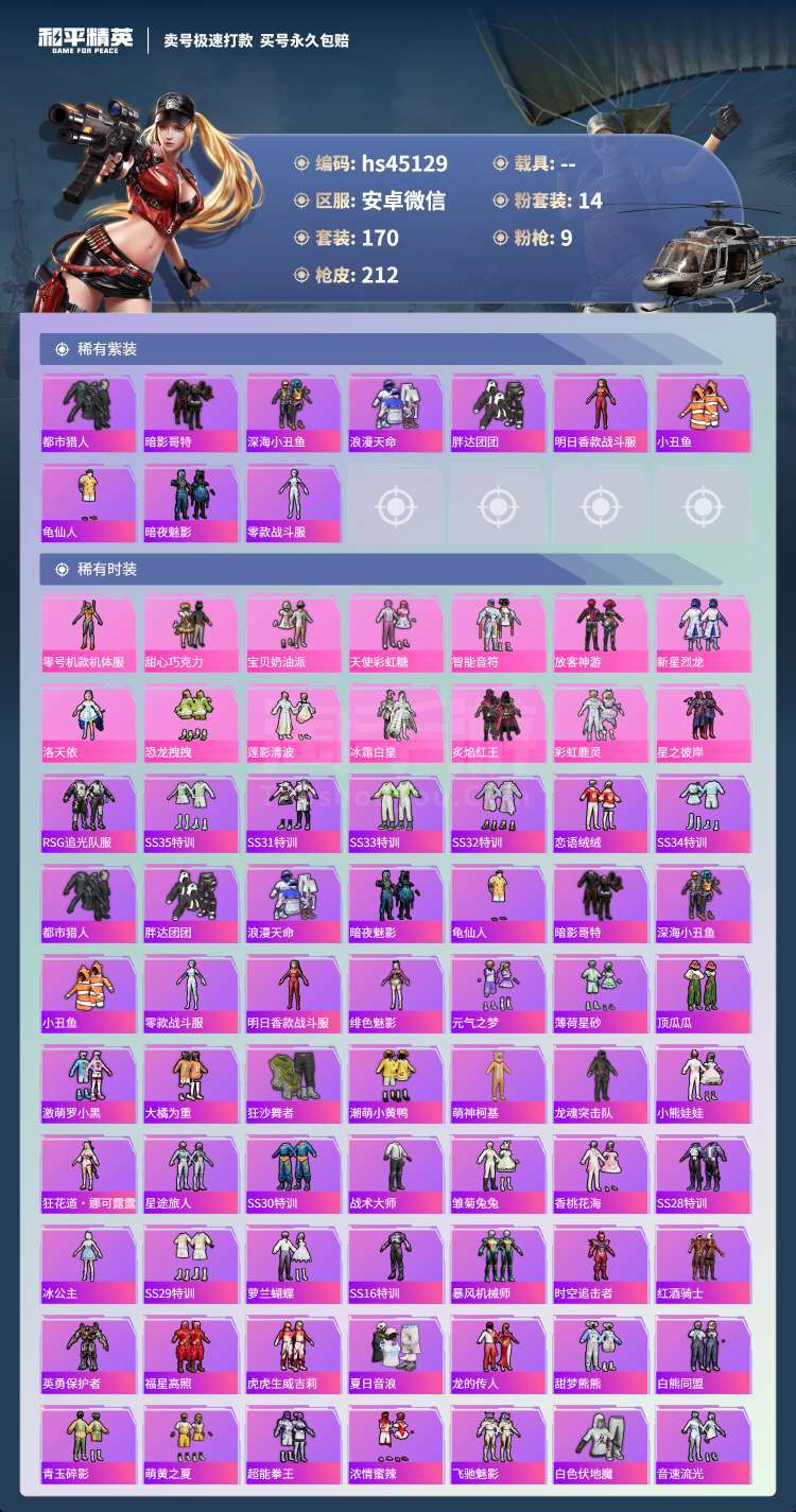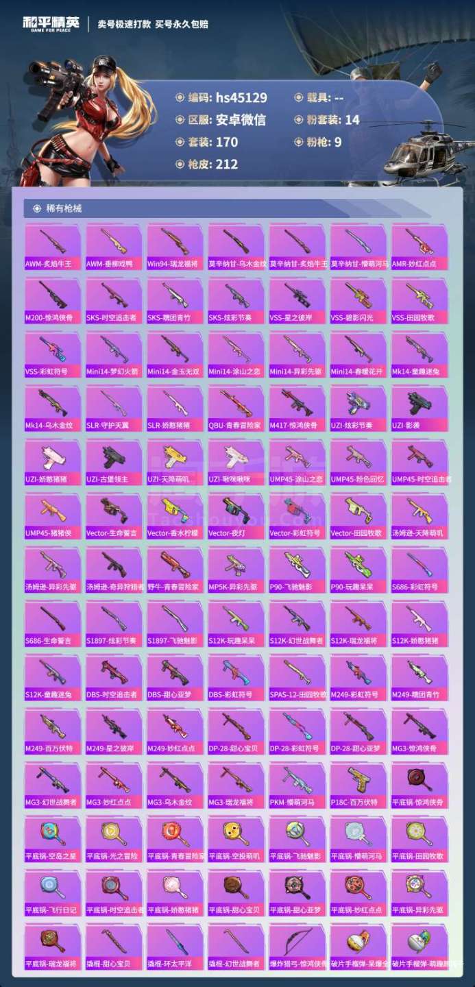 hs45129 安卓微-17王牌印记-14粉装-9特效枪-0载具-82365热力值-170套装-2