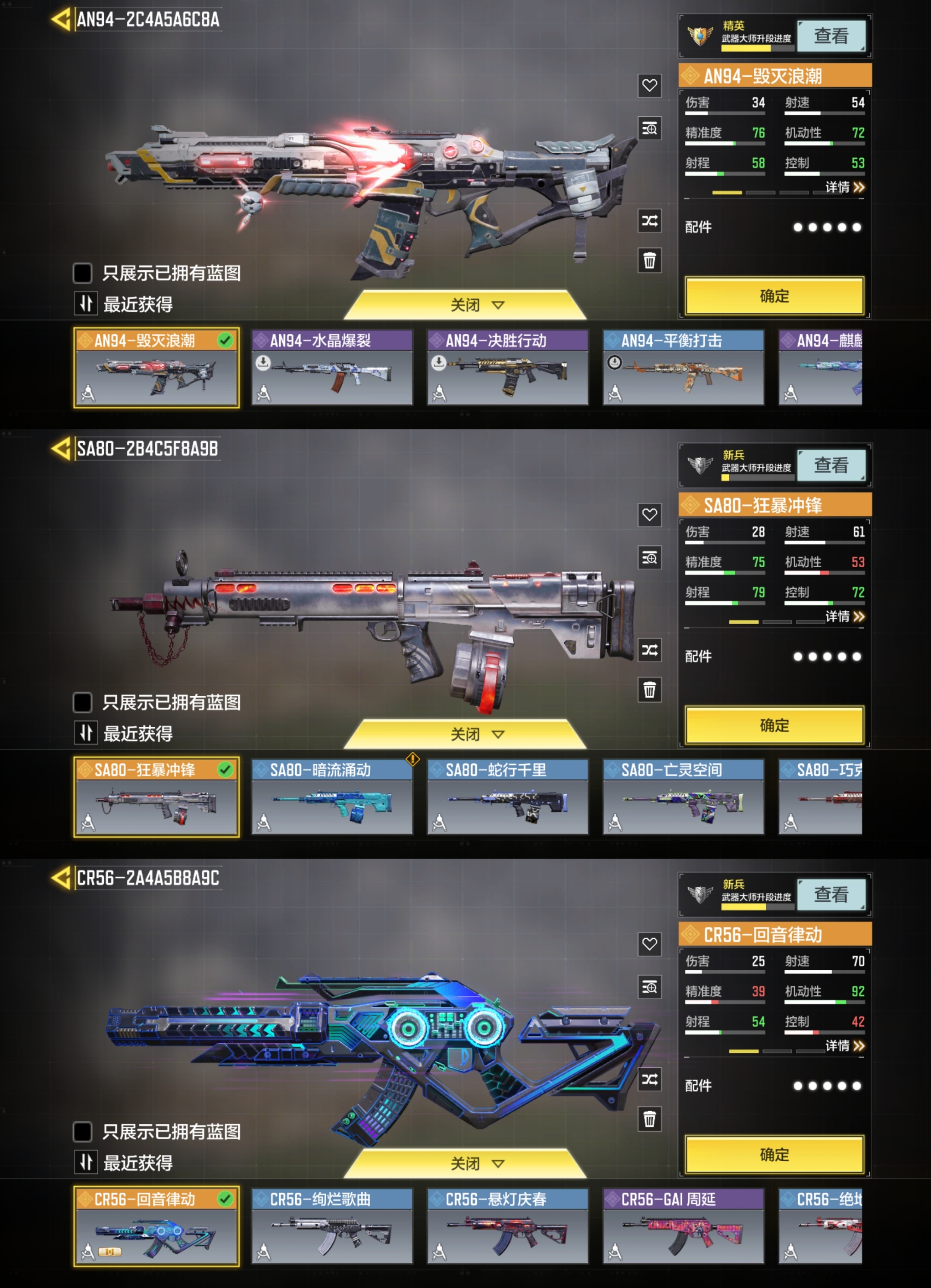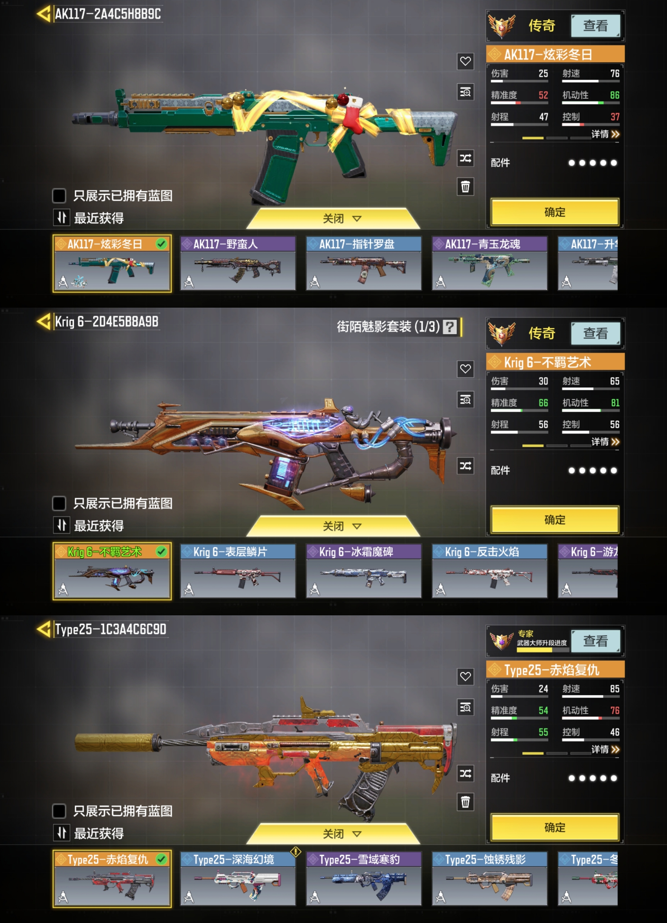 CR56-回音律动 电棍-永恒炽热 SABO-狂暴冲锋 Krig6-不羁艺术 AK117-炫彩冬日