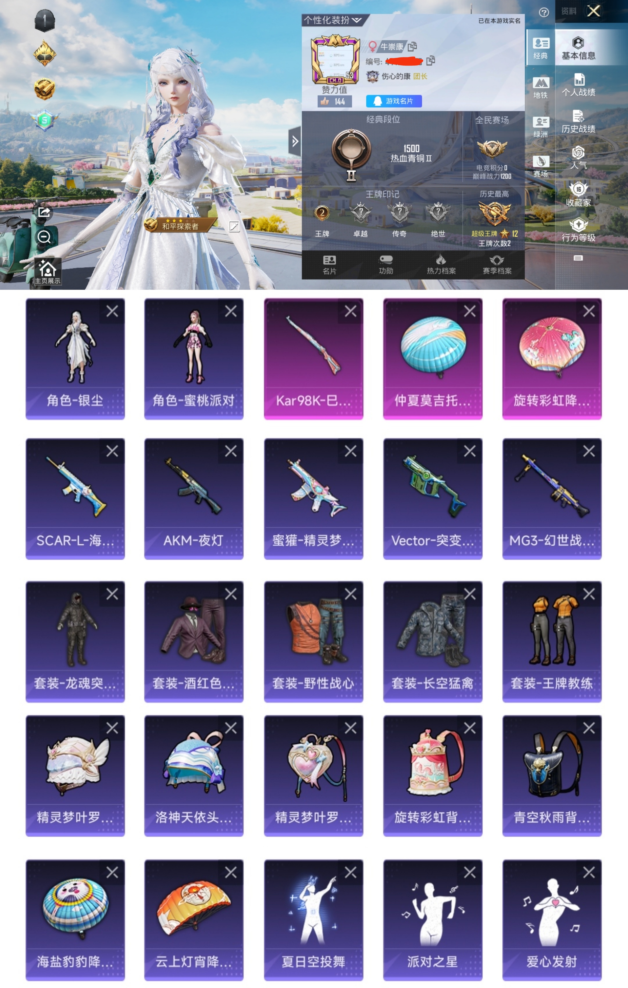 QS46 天花板账号 冬日狙 0违规3太阳 一体和平1特效枪 【传说武器】CR56-回音律动 电棍-永恒炽热 SABO-狂暴冲锋 Krig6-不羁艺术 AK117-炫彩冬日 DLQ33-炫彩冬日 Type25-赤焰复仇 M4-皇家黑魂 AN94-毁灭浪潮 【安q-等级364-神话0-传说9-砖石皮0-紫枪296-角色63-载具41】 【史诗武器】Holger26-幻境行旅 棒球棍-蛇行千里 ZRG