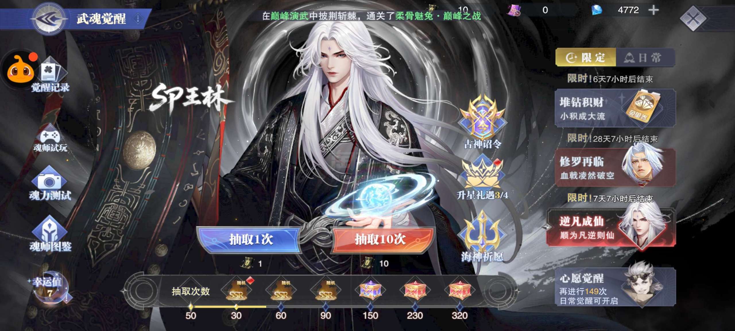 踏天斗罗1区:50抽sp王林+三个sp王林随机箱,30级钻石4700,愿欧皇的你箱子开3个sp王林