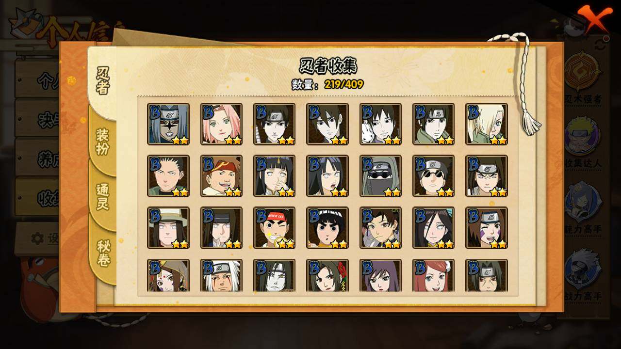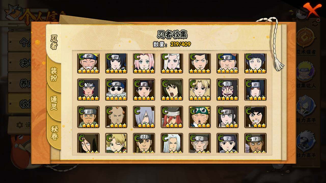 【S级忍者】:猿飞日斩「秽土转生」(3星),千手柱间「秽土转生」(3星),宇智波鼬「秽土转生」(3星),宇智波斑「秽土转生·解」(3星),春野樱「忍界大战」(3星),宇智波带土「忍界大战」(3星),宇智波鼬「须佐能乎」(3星),宇智波斑「木叶创立」(