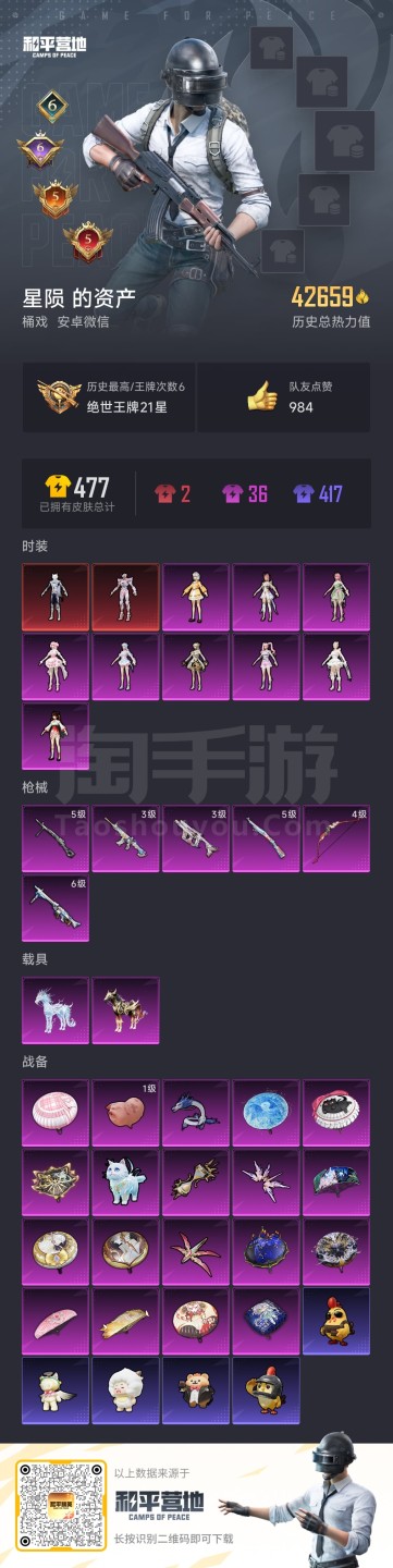 和平精英【安卓微信】双字ID在榜祈福者,另外还有张改名卡,2红9粉6枪2载具,枪皮都是充过钱的皮肤,衣服也很多