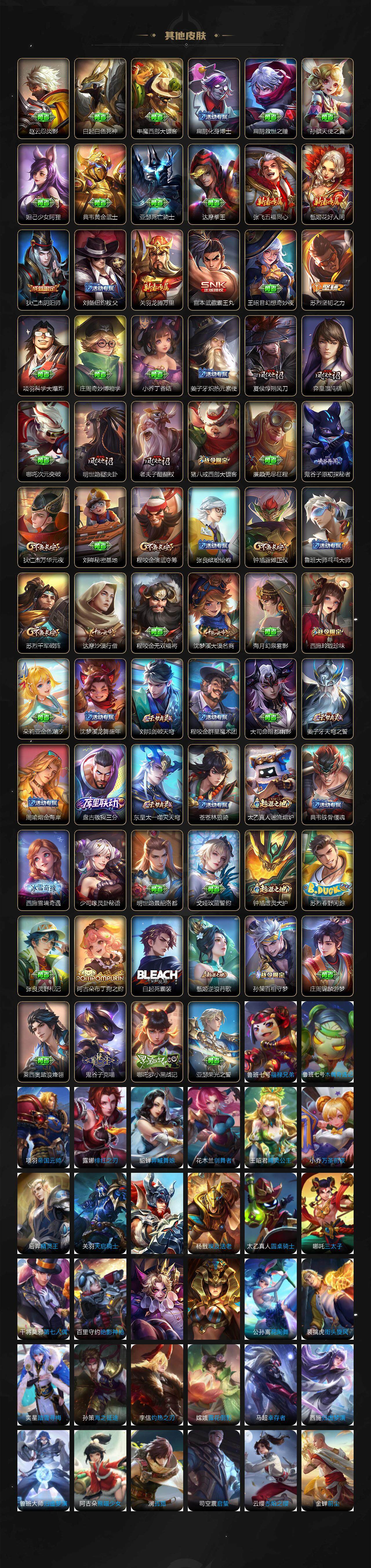 【限定皮肤】:蒙犽顽岩魄,姜子牙天穹之誓,狄仁杰阴阳师,赵云皇家上将,元歌无心,夏侯惇朔风刀,马可波罗暗影游猎,狄仁杰魔术师,狄仁杰万华元夜,达摩沙漠行僧,项羽海滩派对,老夫子醍醐