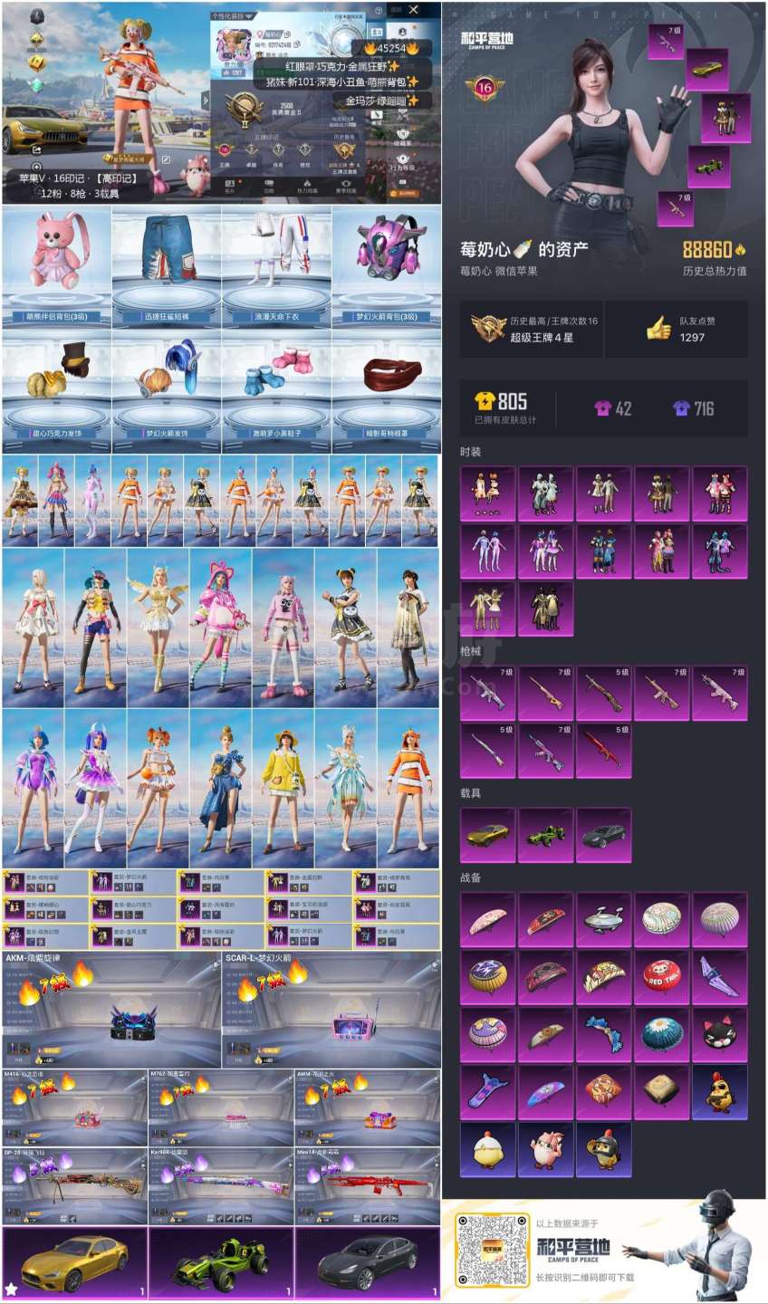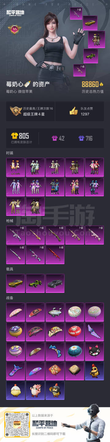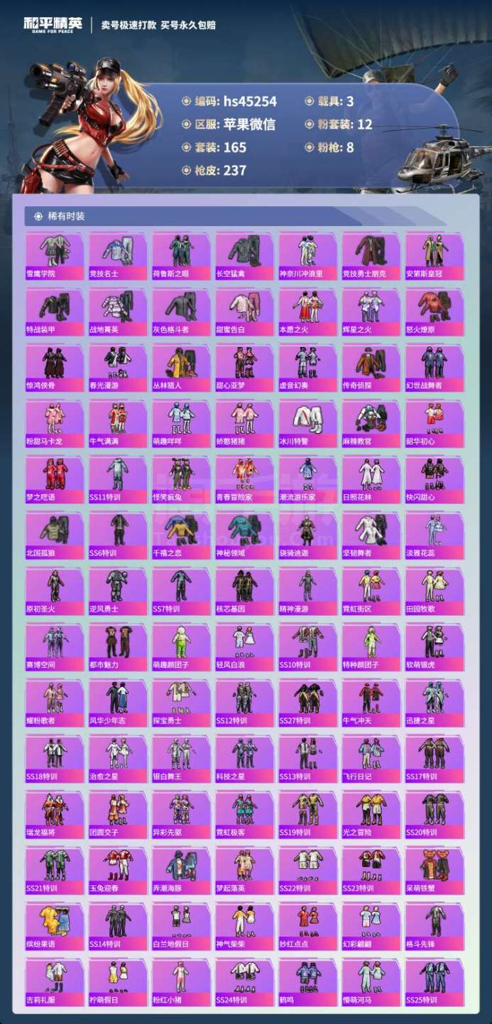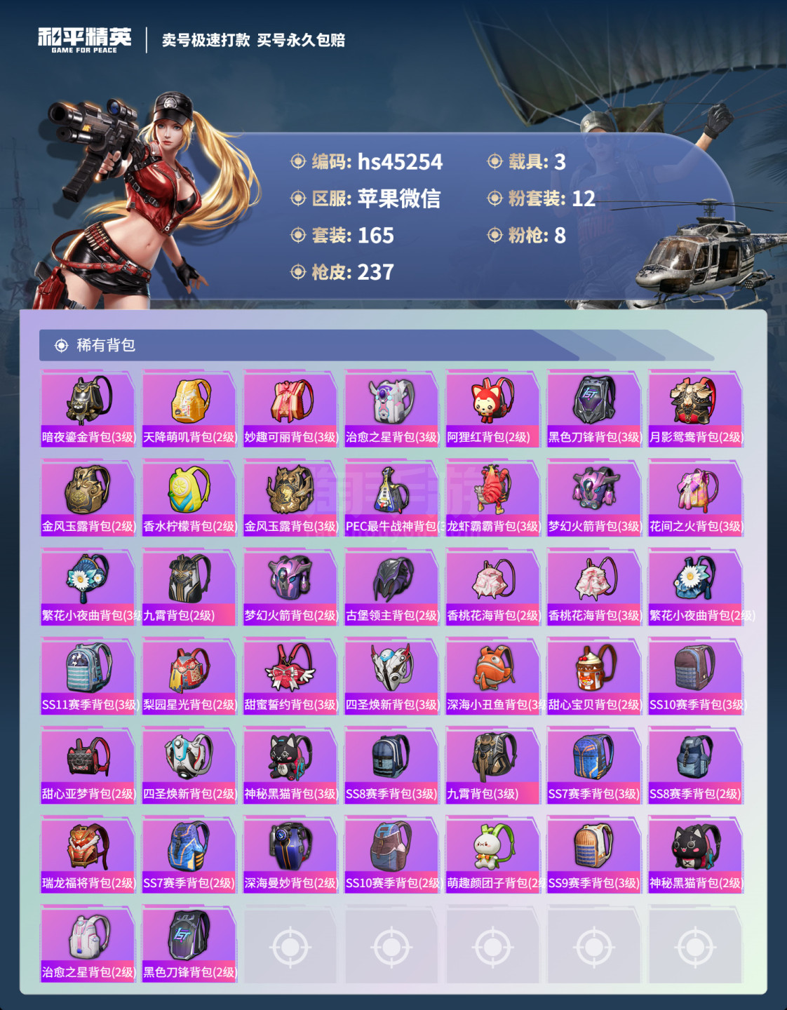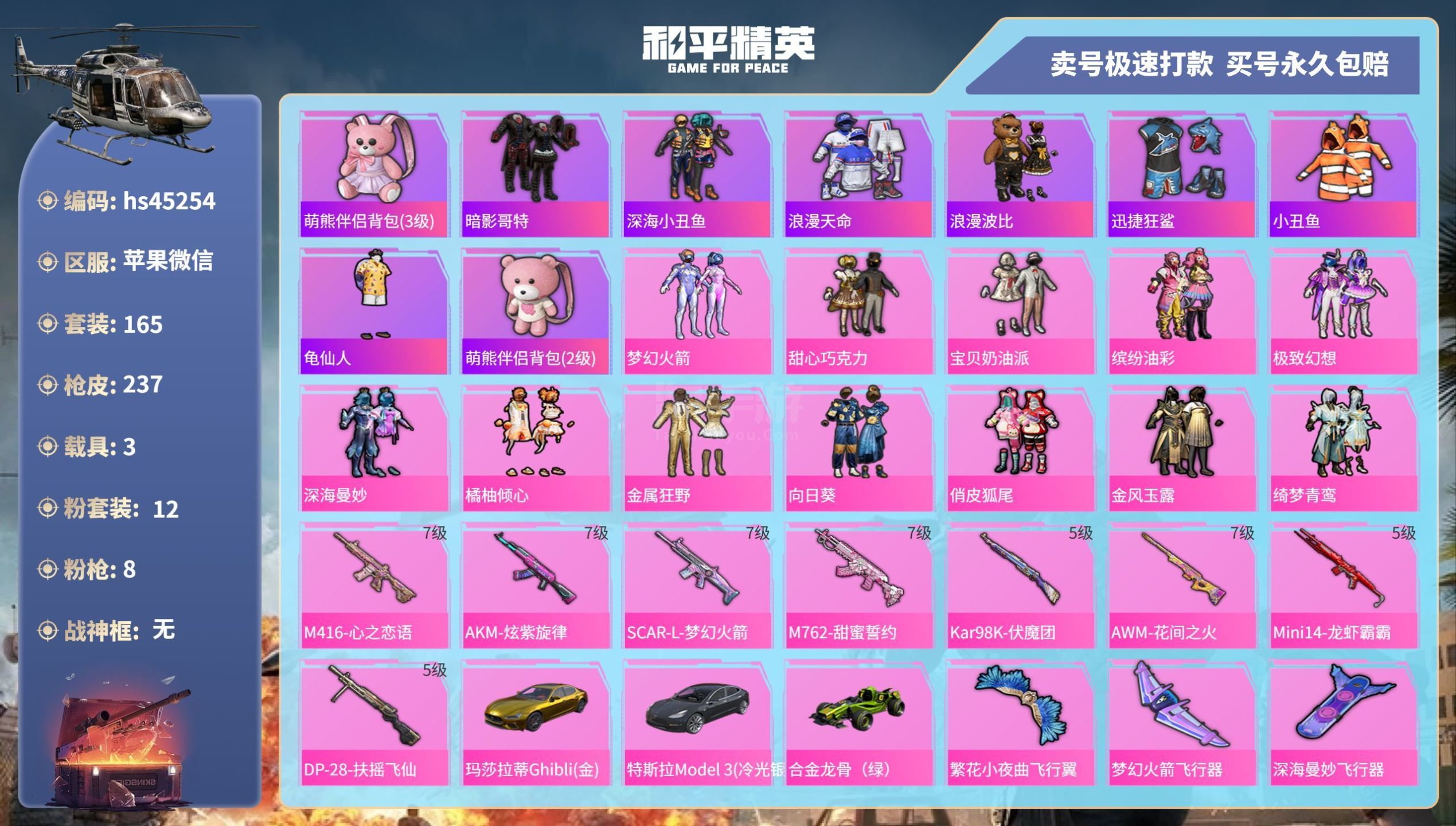 hs45254 苹果微-16王牌印记-12粉装-8特效枪-3载具-88875热力值-165套装-2