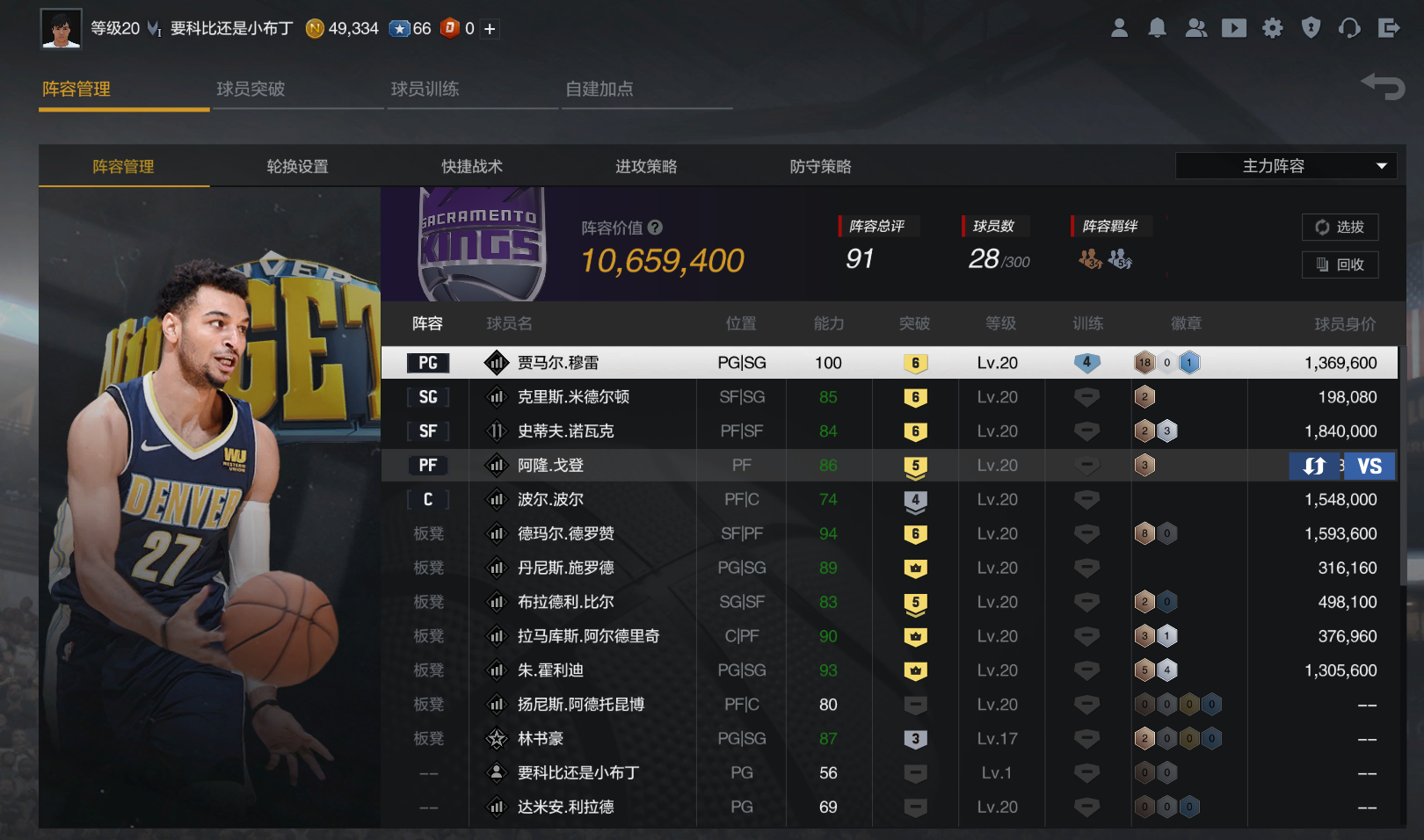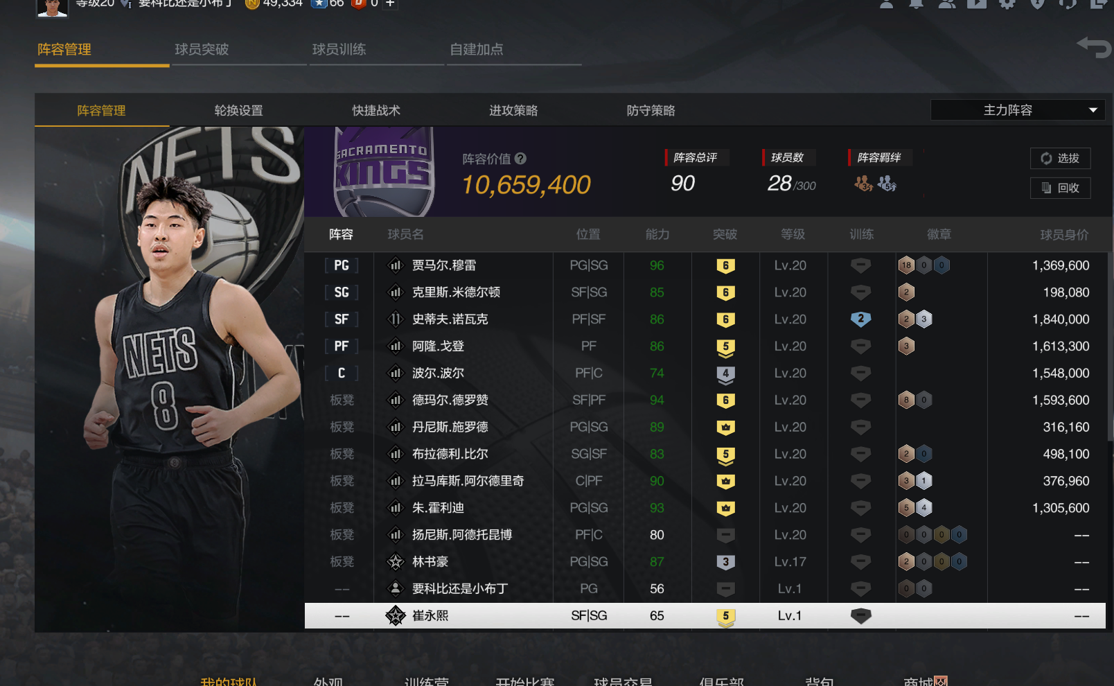6德罗赞 6穆雷 7霍勒迪 中投三分过高线,上班玩不了了,一千万总评90,满突可上110,特训满。林书豪崔永熙。搭配完成的阵容 个头除了施罗德可更换,全满突可以110以上,没时间玩,可小刀。平台诚信价