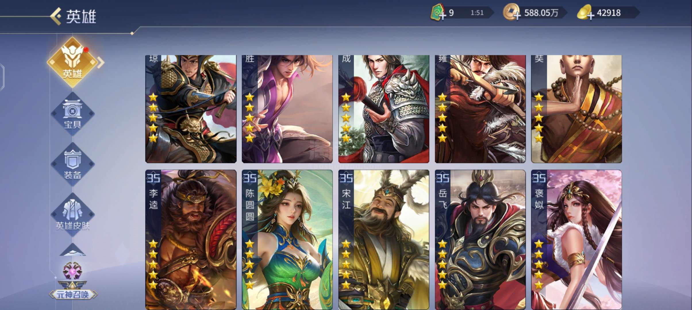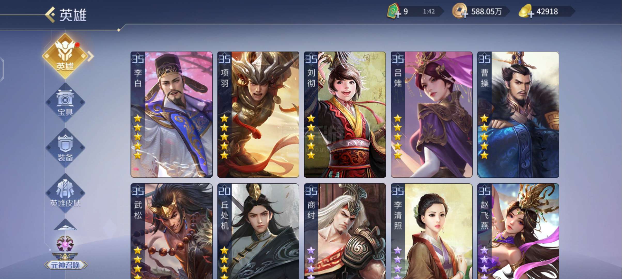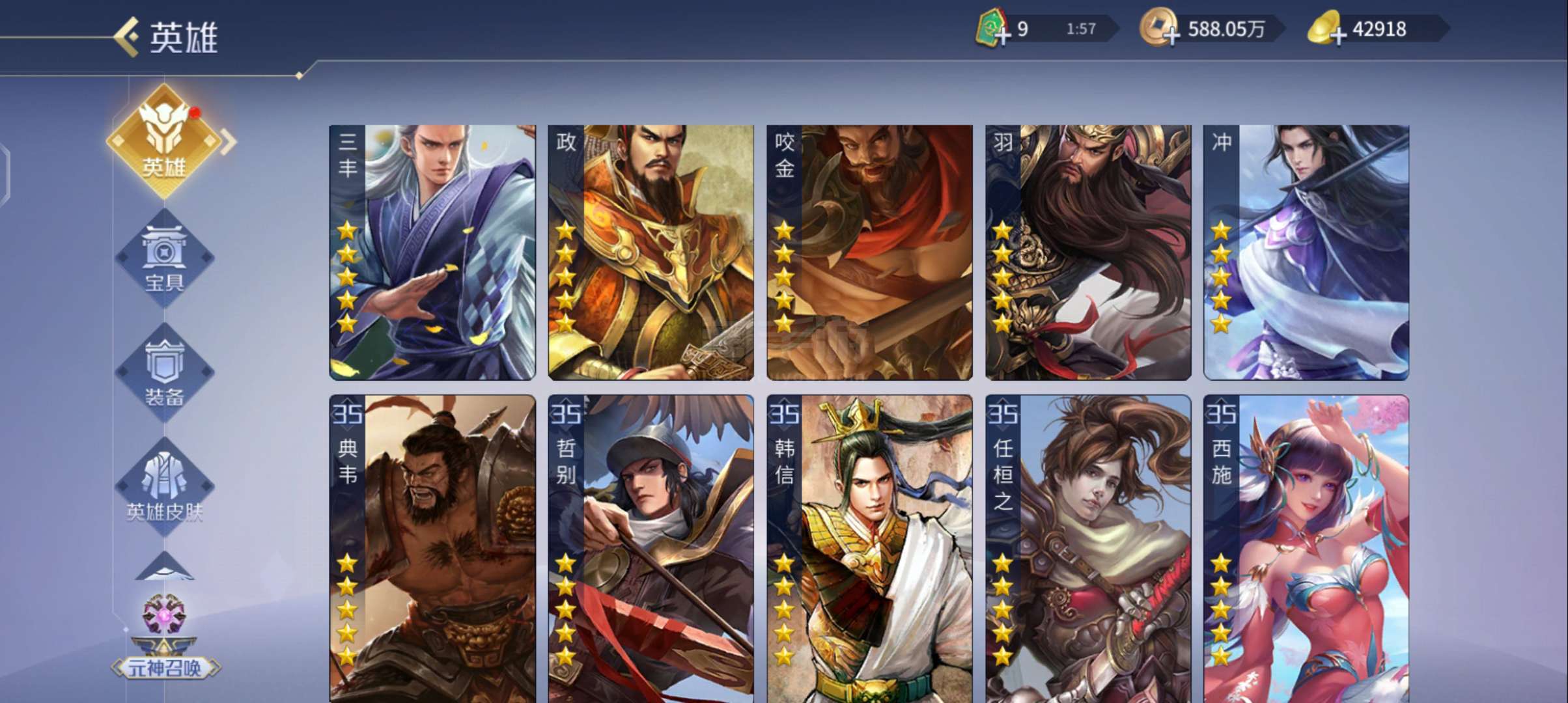 吕布哲别商偷v11七套四星带刀,英雄四十七差不多三百星,元宝四万多