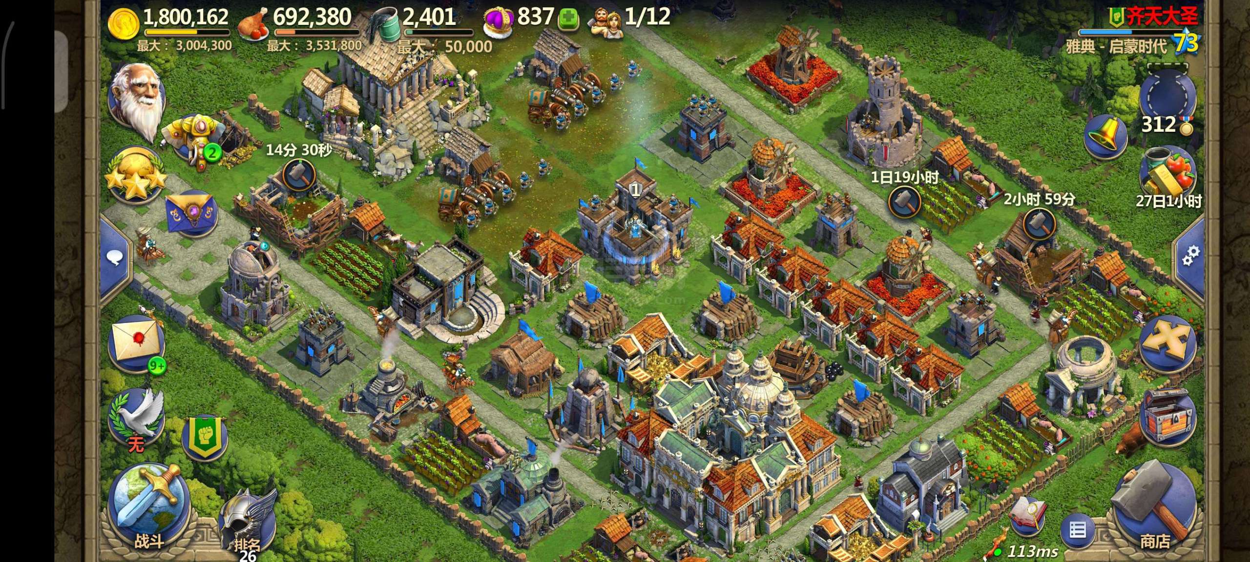 战争与文明【安卓小7手游】一级不到一块钱的75级启蒙小号,平台有5折充值折扣,房屋已经买完了,有好几个高星文物,800多的皇冠