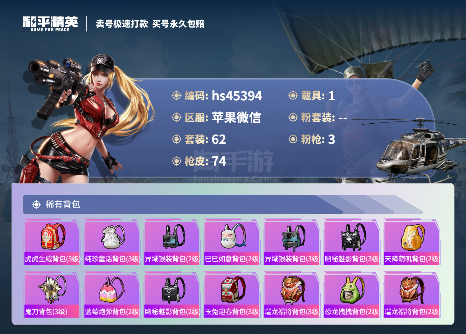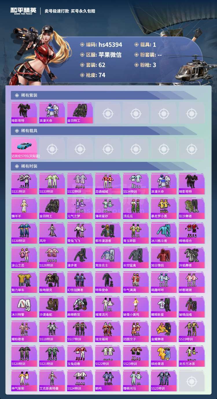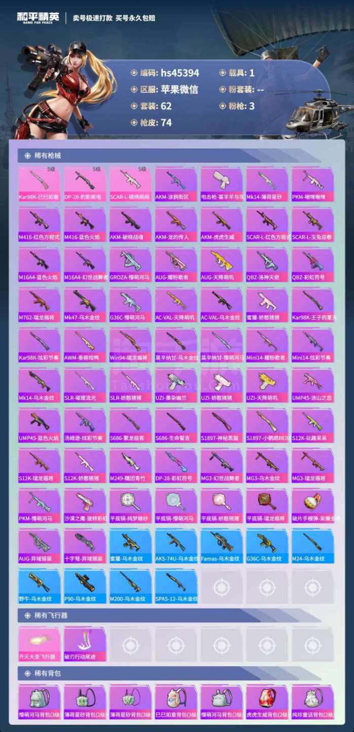 hs45394 苹果微-1王牌印记-0粉装-3特效枪-1载具-23380热力值-62套装-74枪皮