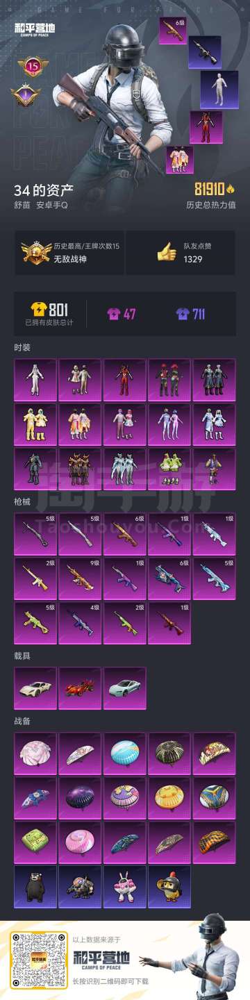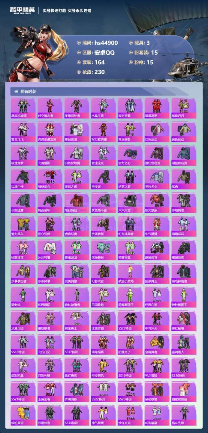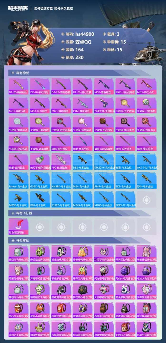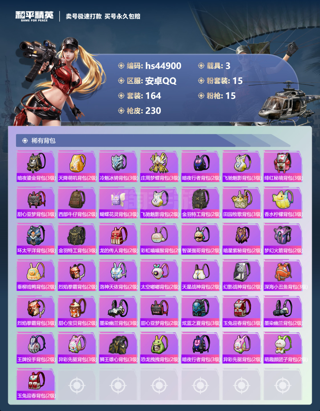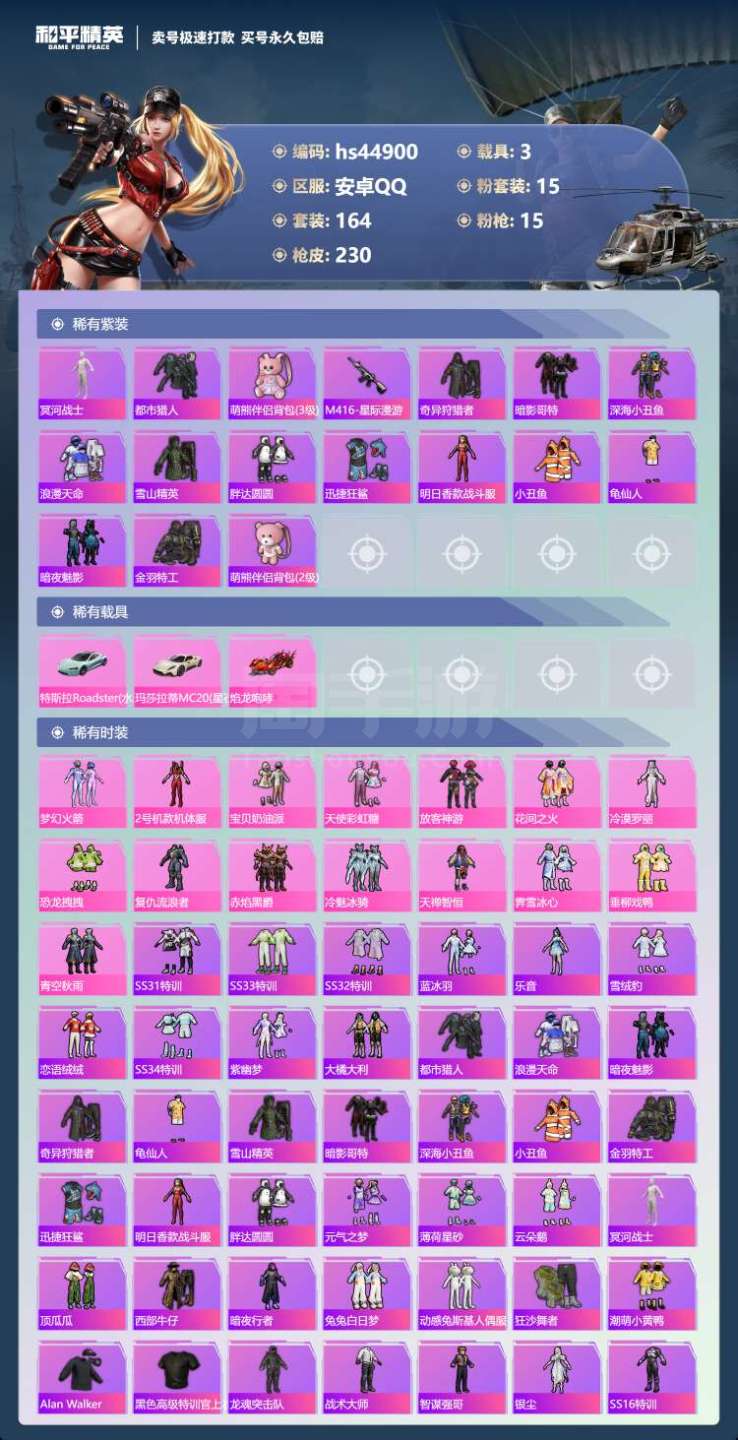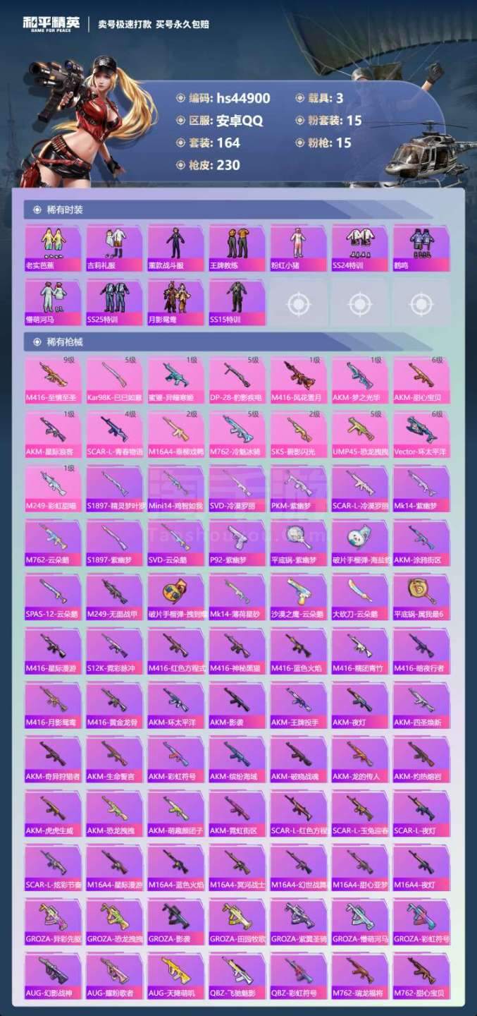 hs44900 安卓手Q-15王牌印记-有战神框-15粉装-15特效枪-3载具-82230热力值-1