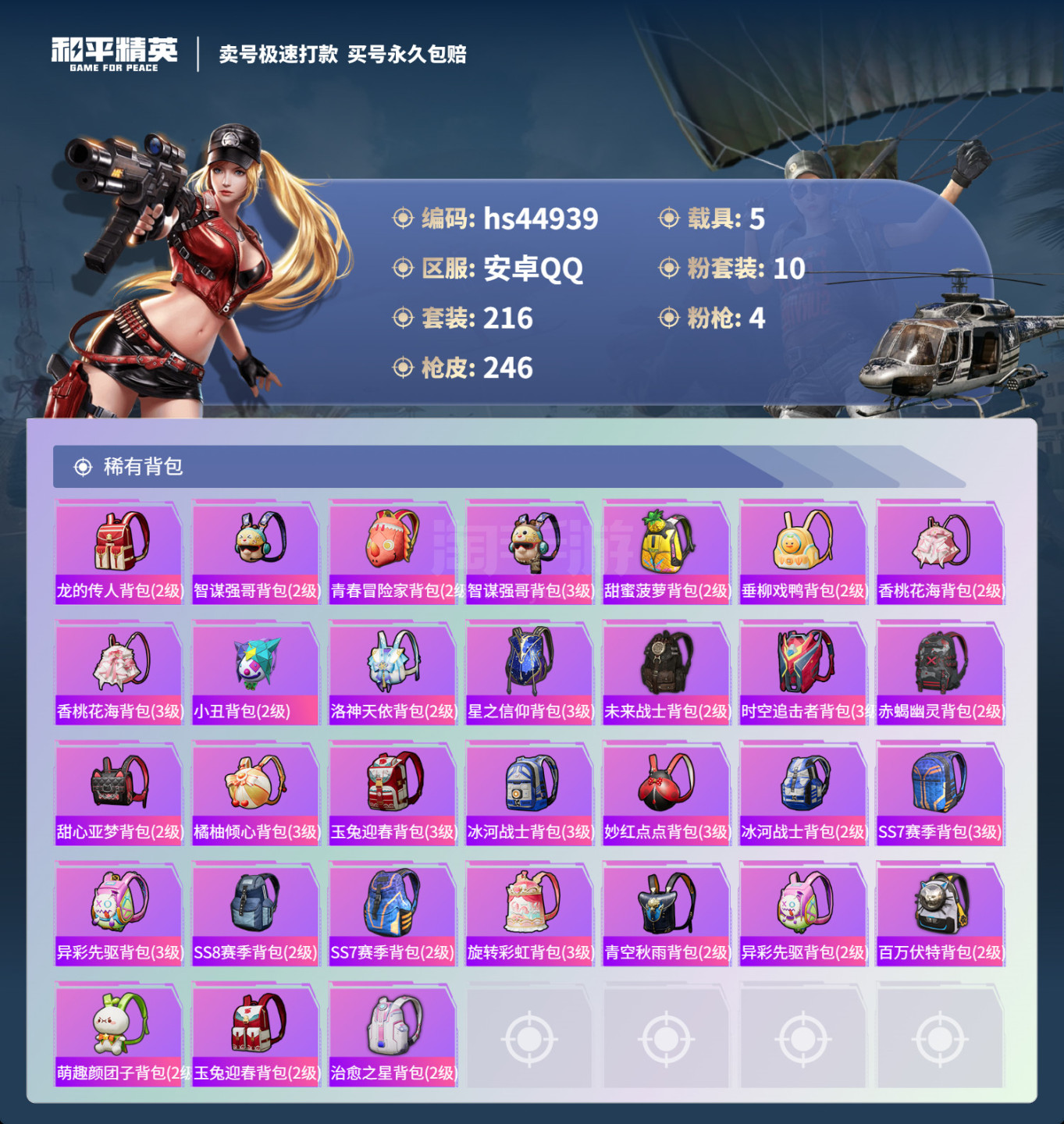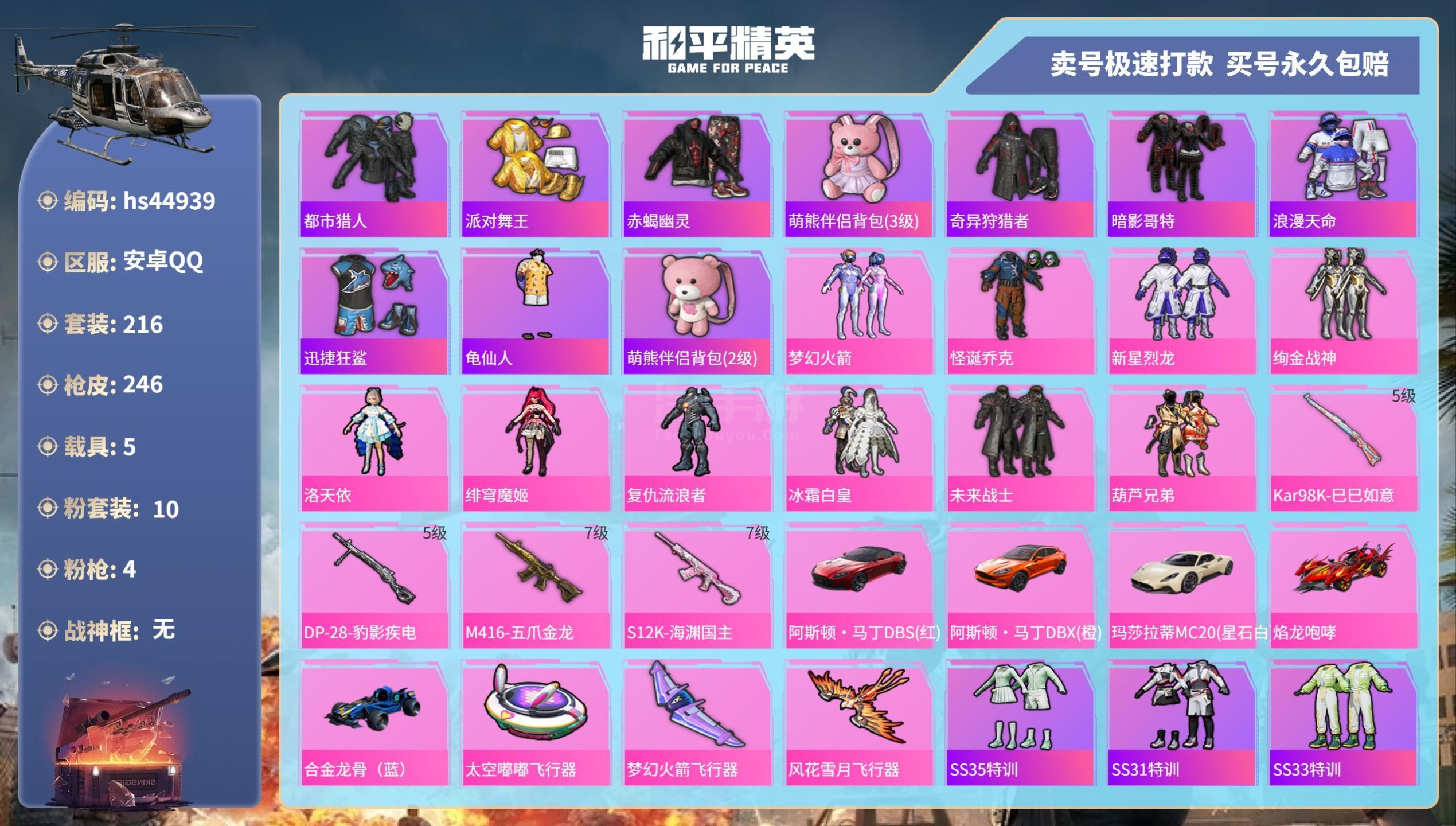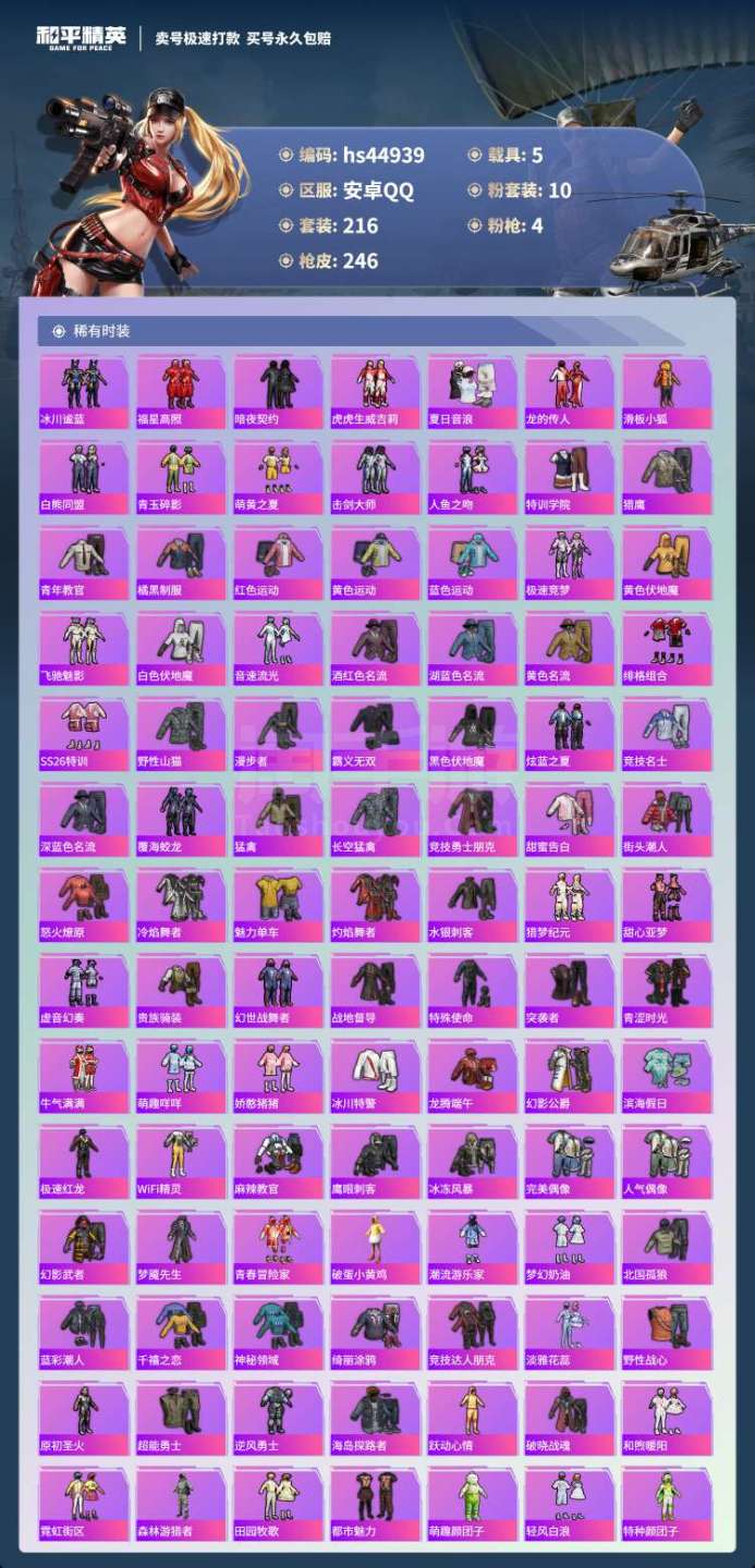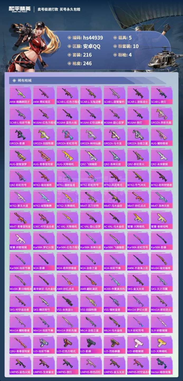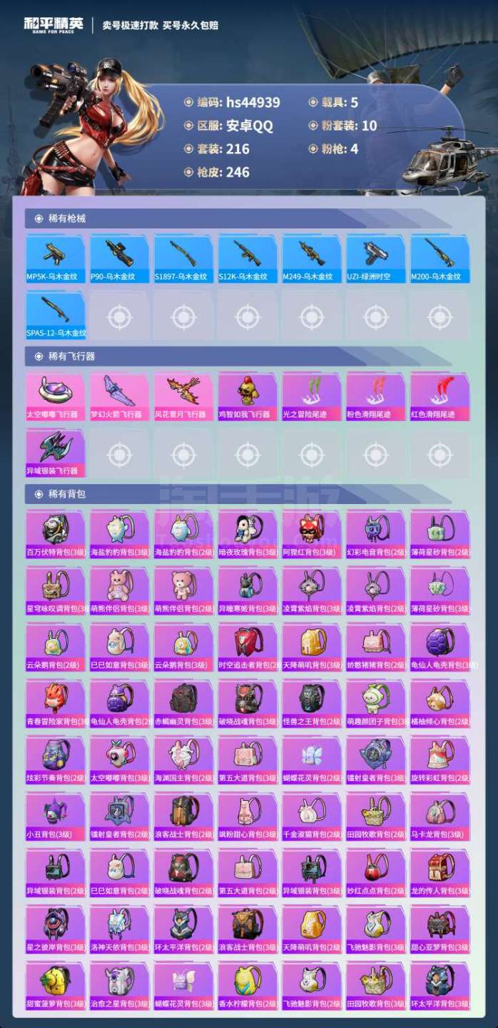 hs44939 安卓手Q-20王牌印记-10粉装-4特效枪-5载具-90039热力值-216套装-2