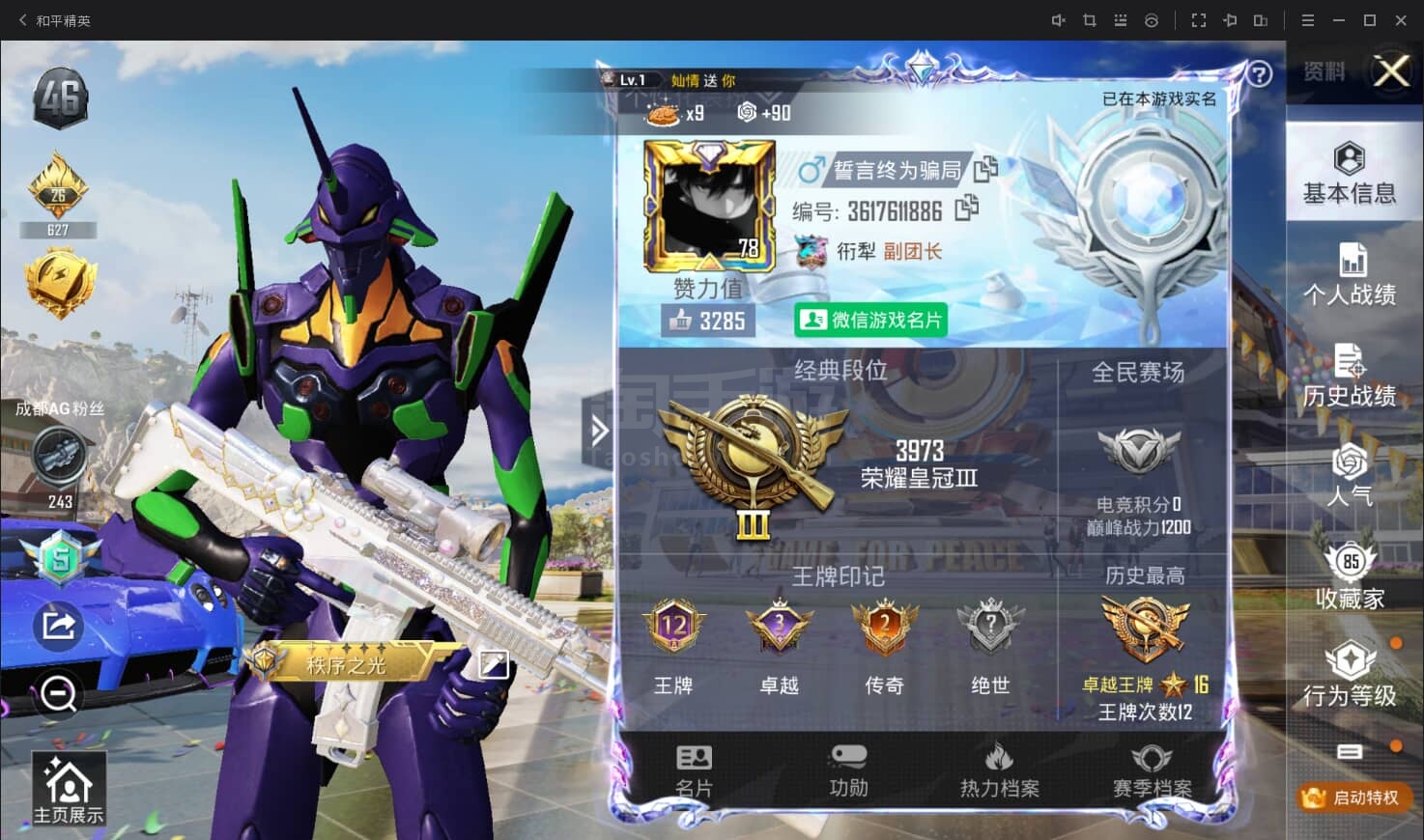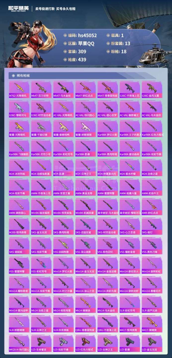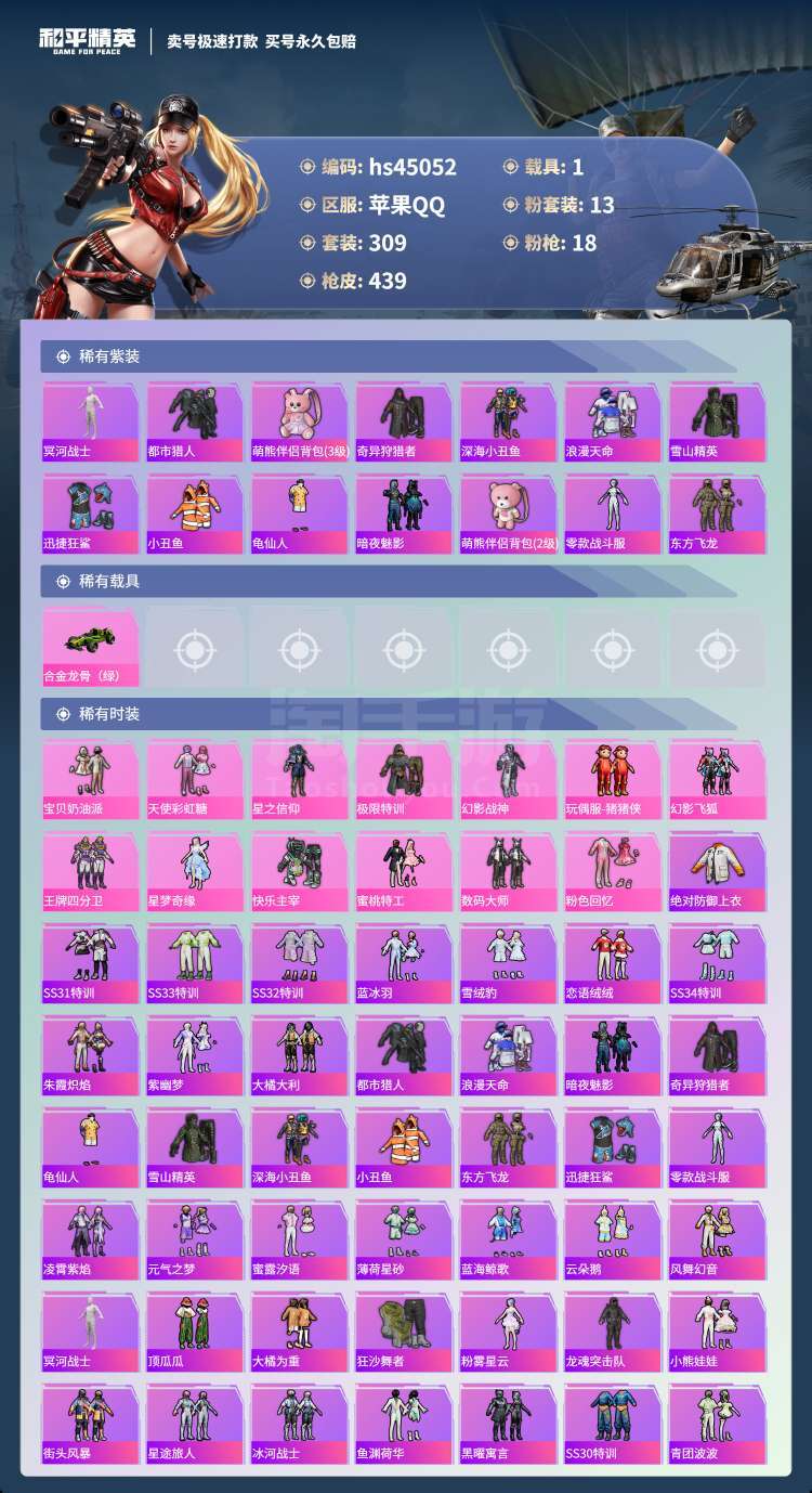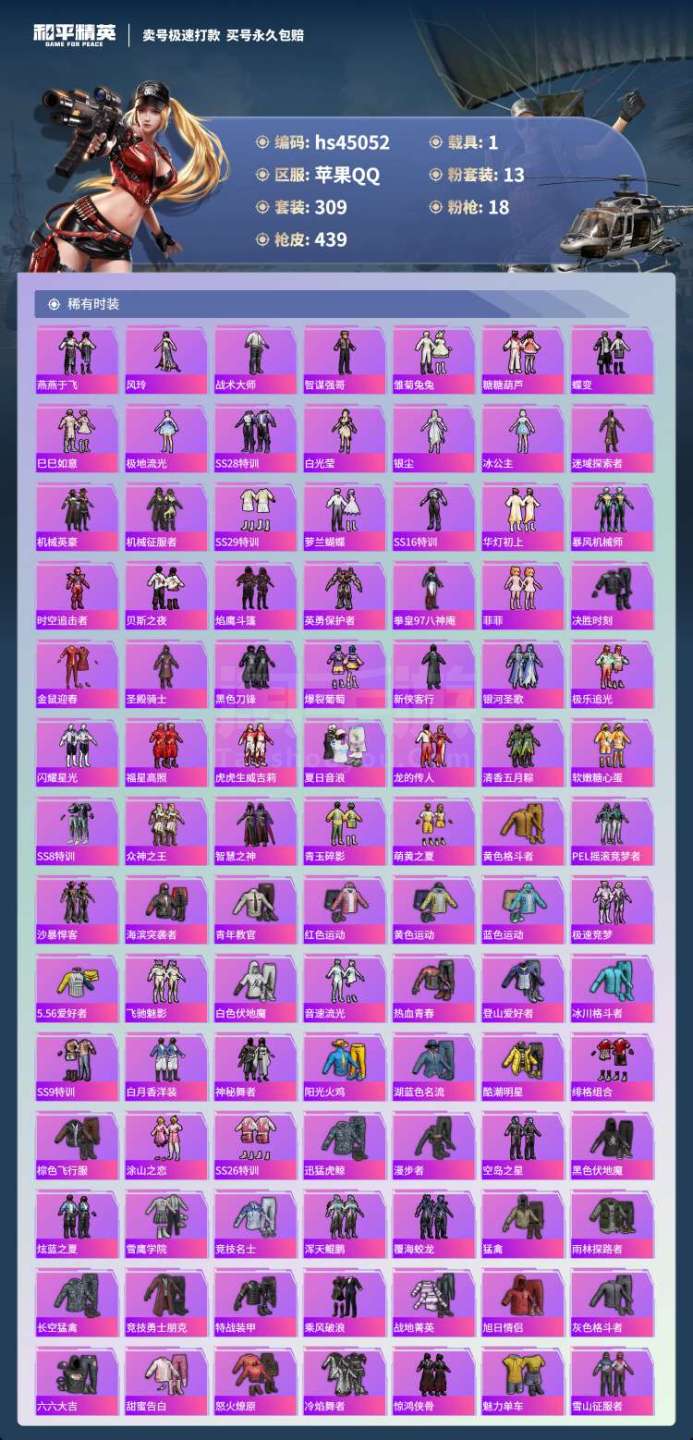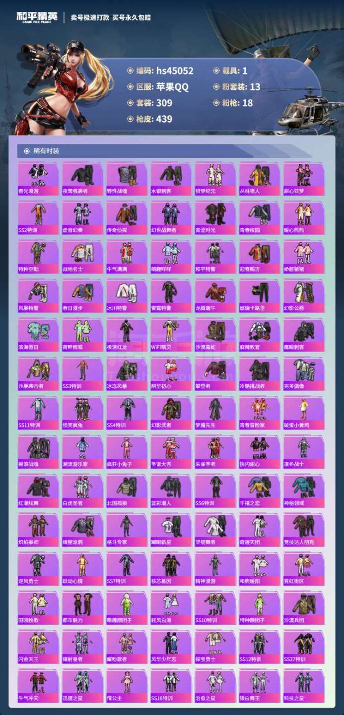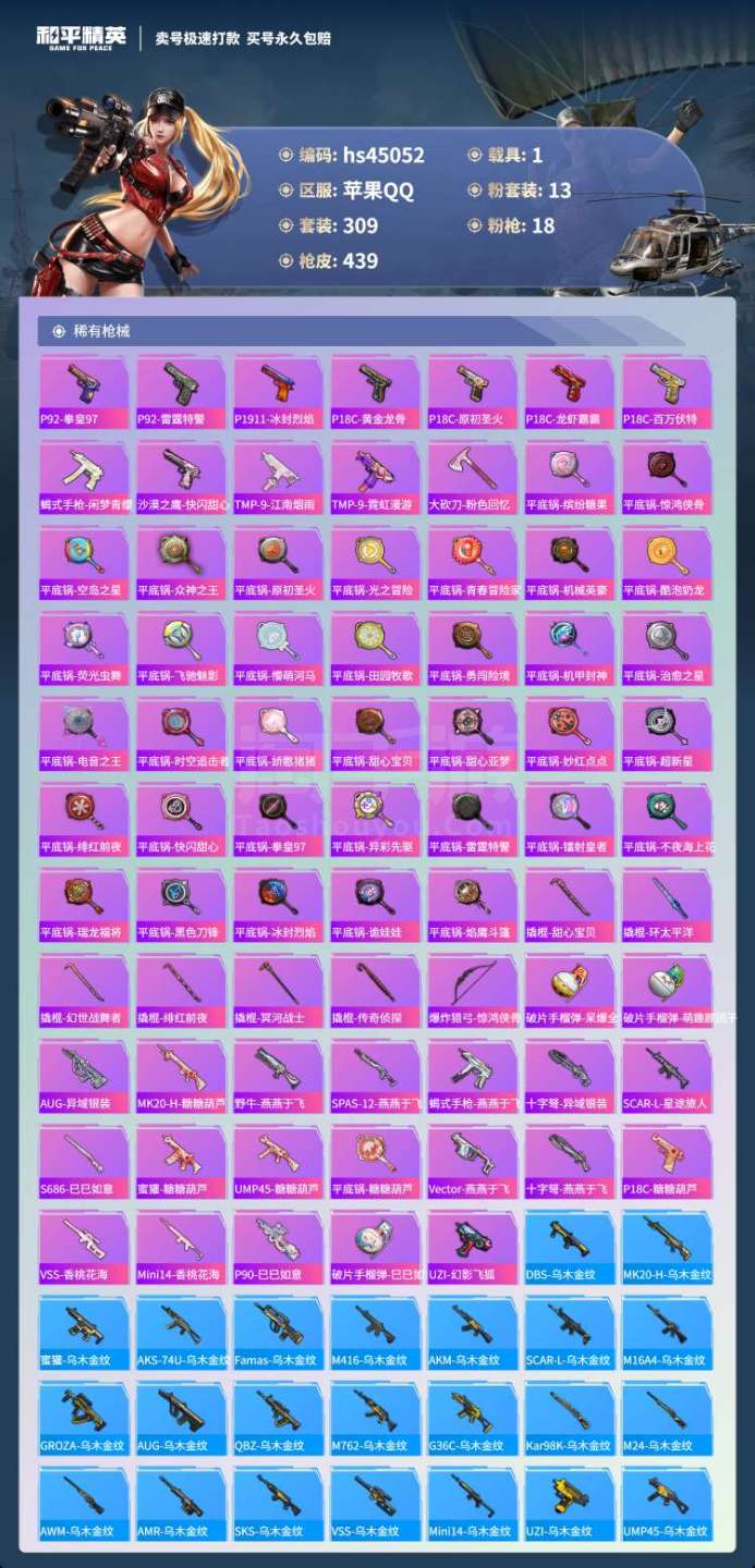 hs45052 苹果手Q-25王牌印记-有战神框-13粉装-18特效枪-1载具-144496热力值-