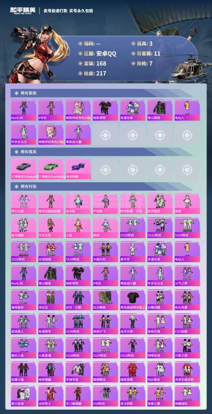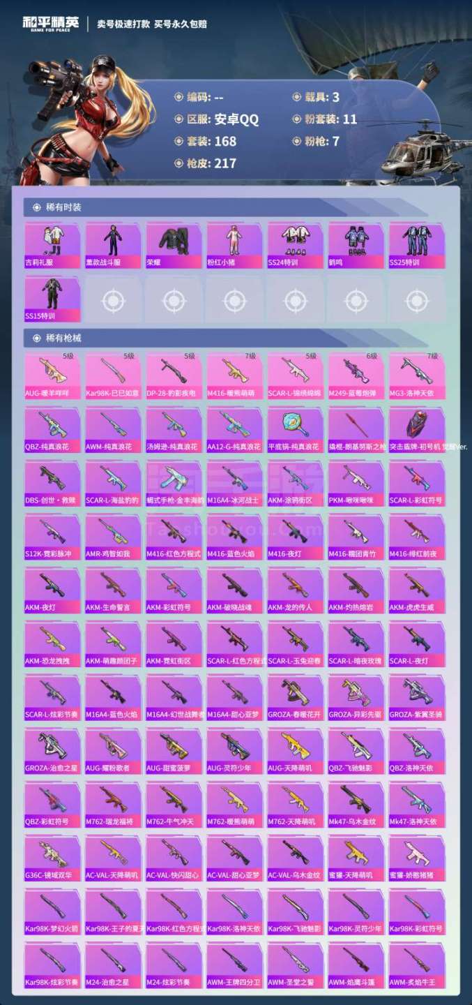 hs43859 安卓手Q-16王牌印记-11粉装-7特效枪-3载具-80254热力值-168套装-2